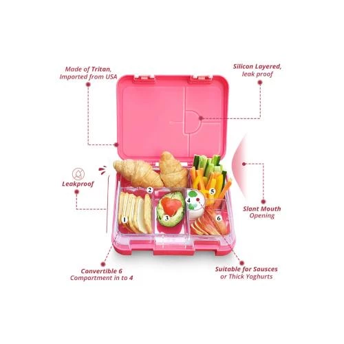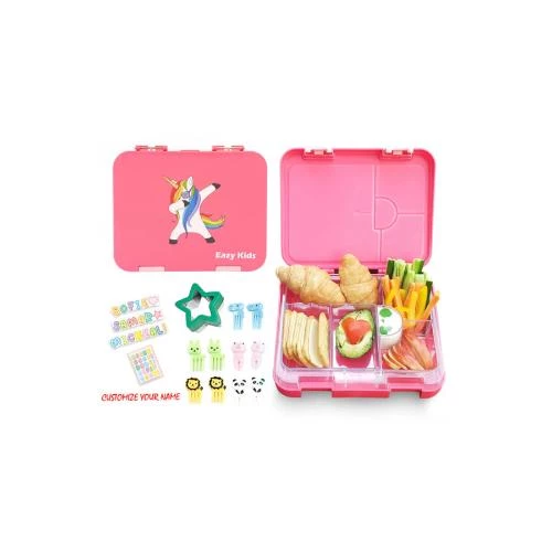 Make every meal magical and mess-free with the Eazy Kids 6 & 4 Convertible Bento Lunch Box in Unicorn Pink. Made from premium BPA- and BPS-free Tritan material with a USA-made inner tray, this innovative lunch box lets you switch between 6 and 4 compartments using the removable partition tray-perfect for portioning balanced meals. Its slant mouth opening offers easy access to food, while the top silicone-sealed lid ensures each compartment remains leakproof, even with thick yogurts and sauces. The removable silicone layer and lower lid make cleaning a breeze, and the lunch box is microwave and dishwasher safe (top rack). Adorned with a lively dancing unicorn design and vibrant colors, it comes with complimentary sandwich cutters, vegetable cutters, and 10 fun animal-shaped fruit picks to spark your childs imagination at every meal. Ideal for school, picnics, or fun meals at home!
