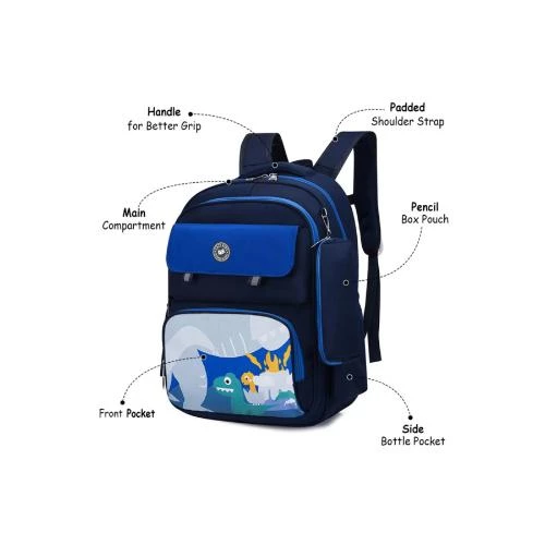 eazy kids school bag, dino school bag, dark blue kids backpack, water resistant backpack, school bag with pencil case, dinosaur backpack for kids, adjustable padded straps, reflective strip school bag, laptop sleeve backpack, durable kids school bag