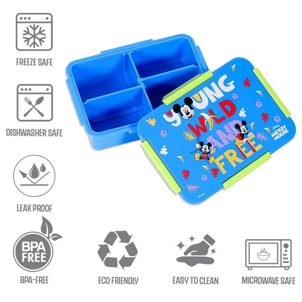 mickey mouse lunch box, disney boys lunch container, blue bento lunch box, leakproof school lunch box, BPA free food tray, 4 compartment lunch box, eco friendly kids lunch gear, kids food box, back to school essentials, cartoon lunch box