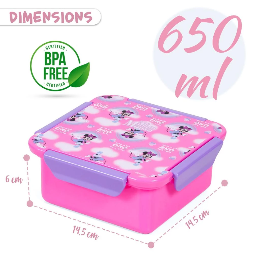Make every mealtime magical with the Disney Minnie Mouse Lunch Box a charming and practical snack container perfect for school, travel, or daily outings. Designed with a vibrant Minnie Mouse print, this 650ml lunch box brings joy to every bite while offering a leakproof and secure experience. It features four easy-to-use clasp locks and a top layer lined with silicone, ensuring that thick yoghurts, dips, and other moist foods stay safely contained.Crafted from BPA-free, non-toxic, food-grade materials, this lunch box is freezer safe, microwave safe (without lid up to 100°C), and dishwasher safe (top rack without lid). Its lightweight yet durable build makes it easy to carry, and the colorful Disney theme makes it a favorite companion. Complete the set with a matching Minnie Mouse water bottle for a coordinated and fun back-to-school vibe.