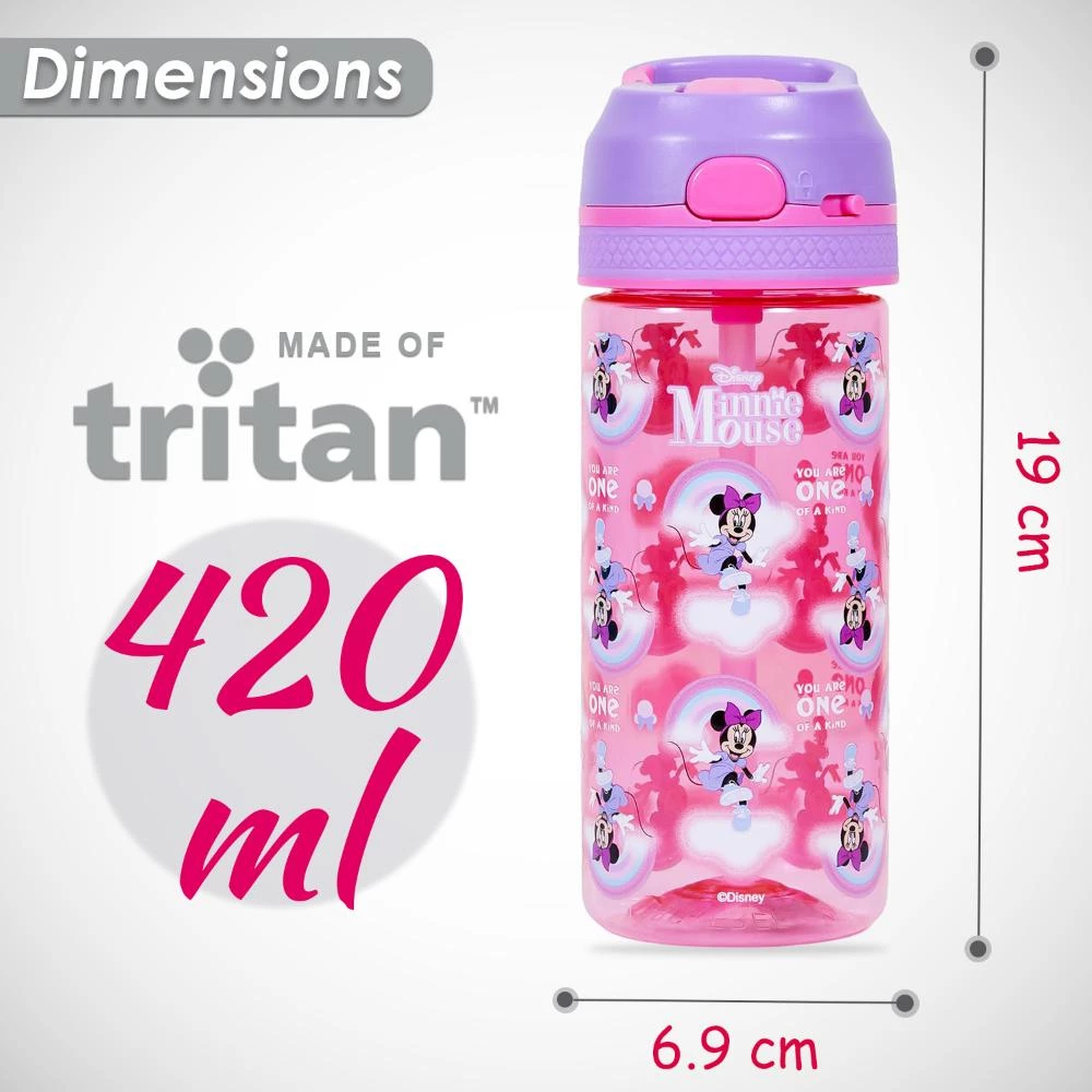 Eazy Kids Disney Minnie Mouse Water Bottle - 420ml Tritan Leakproof Bottle with Lock Button & Handle - Purple Pink