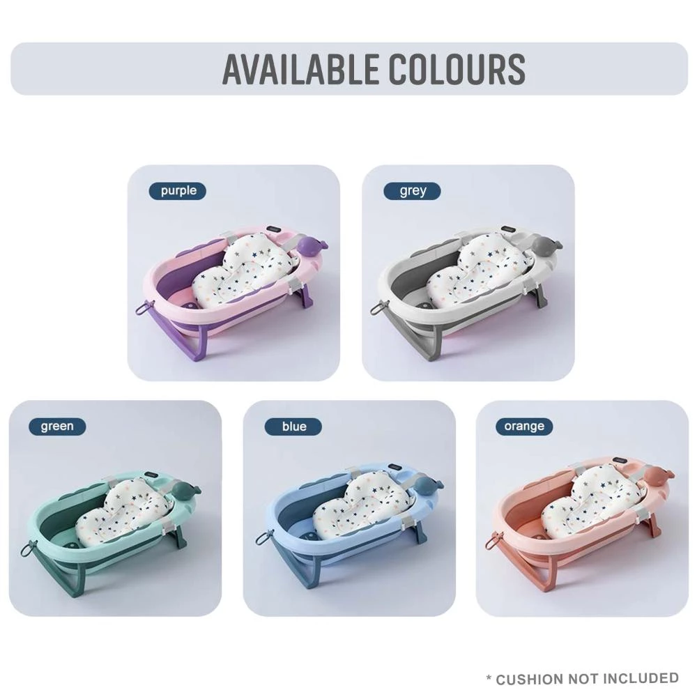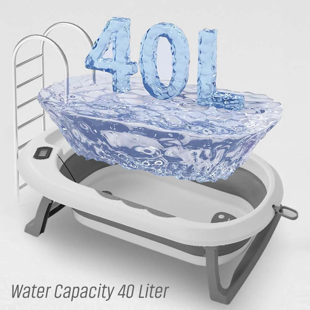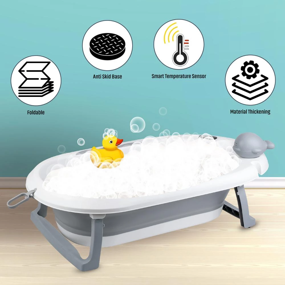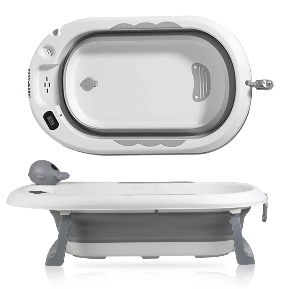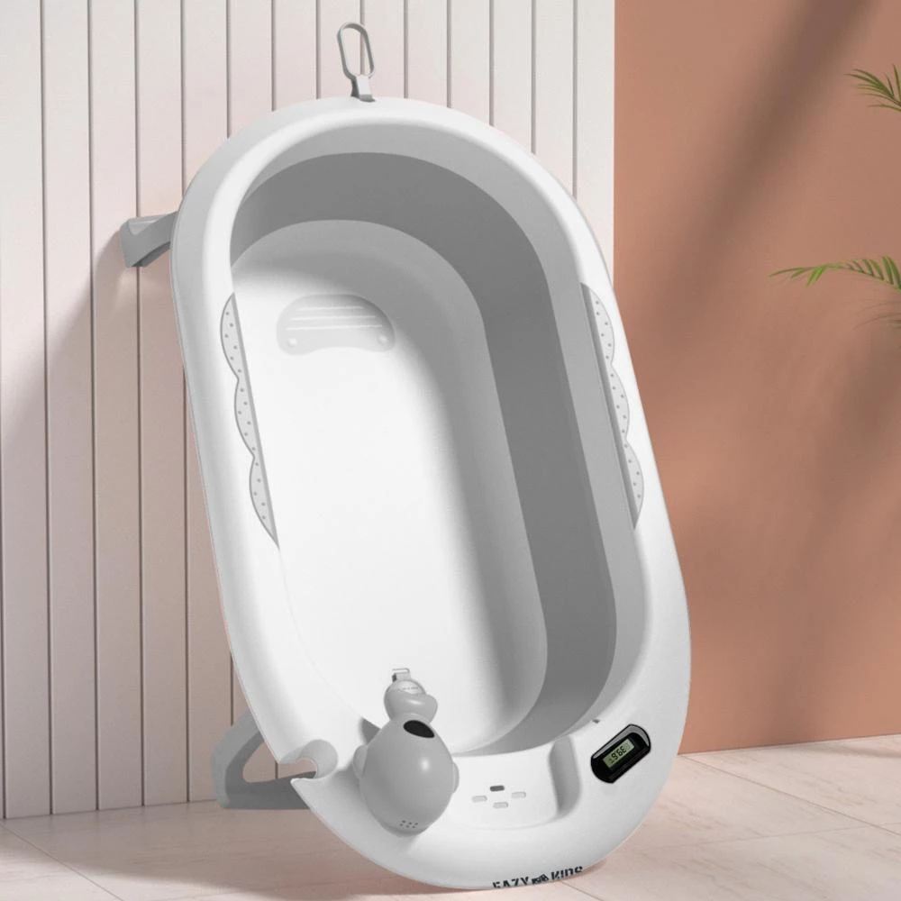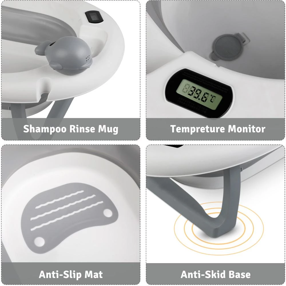 foldable baby bathtub, temperature controlled bathtub, baby bath with thermometer, anti-skid baby tub, space-saving baby bath, foldable infant bathtub, baby bath accessories, shampoo rinse mug, portable baby tub, grey baby bathtub