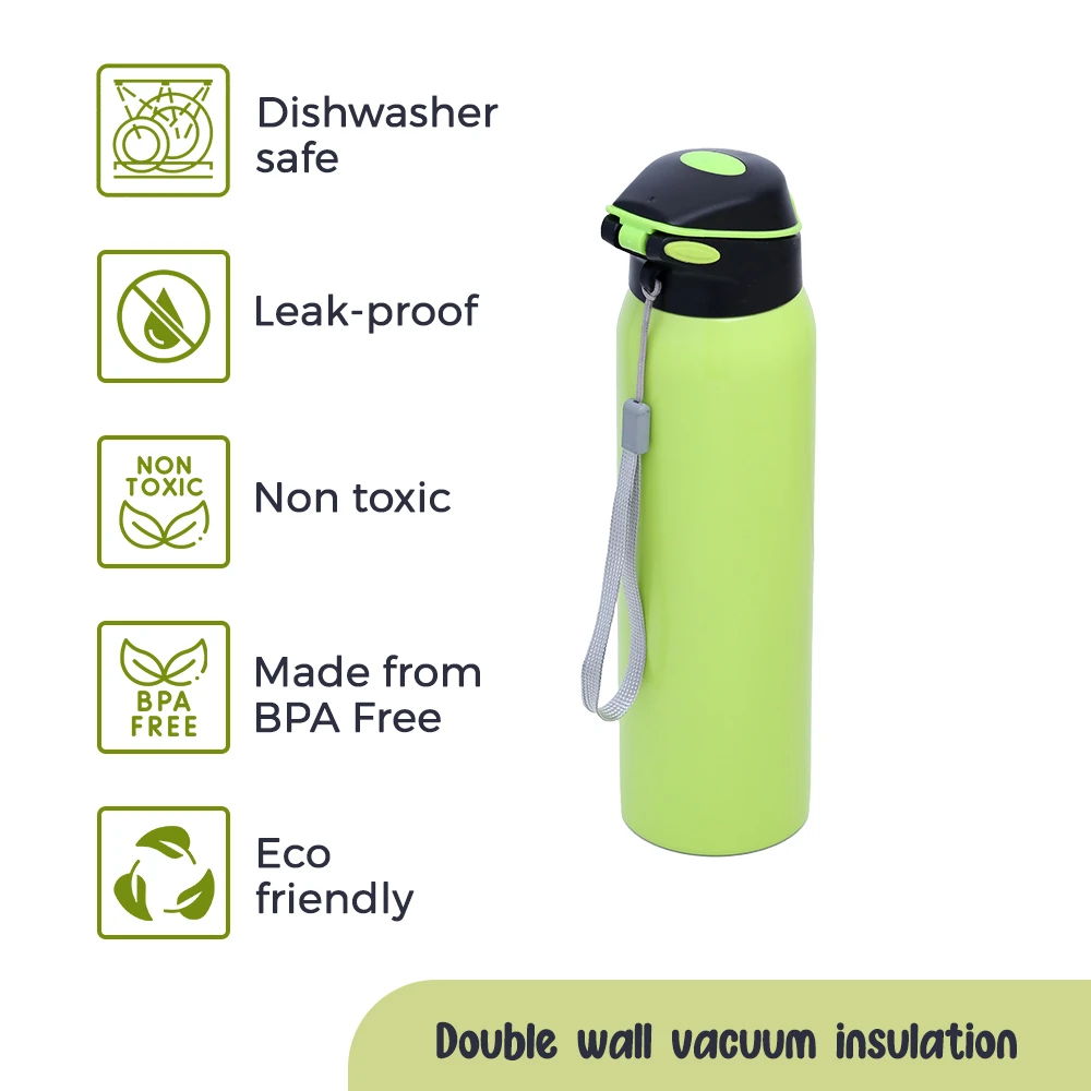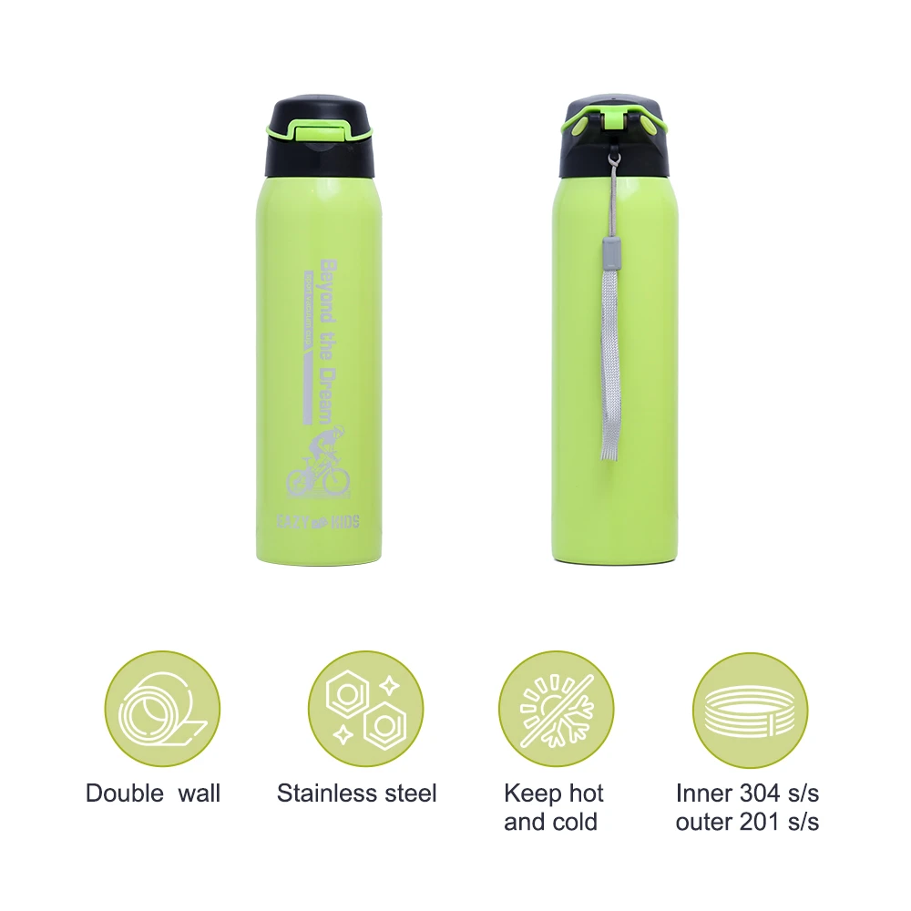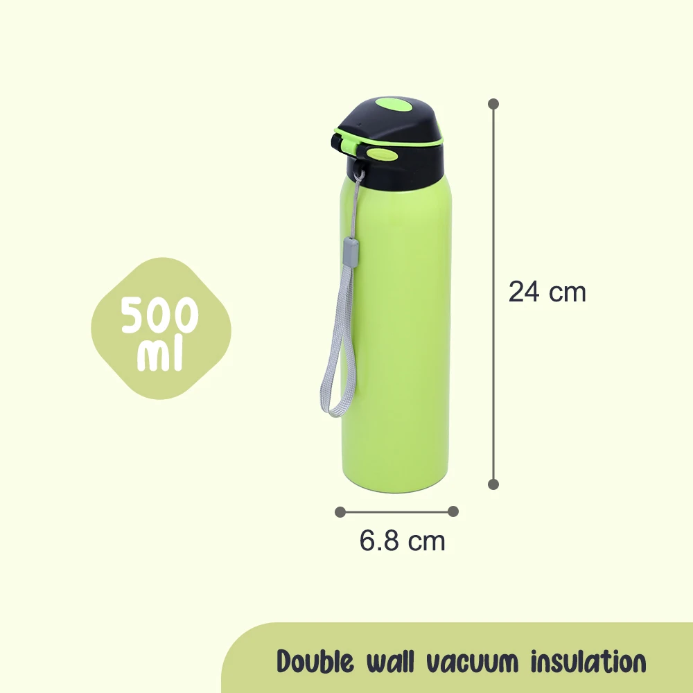 insulated water bottle, green bottle, 500ml bottle, stainless steel bottle, double wall insulation, leak proof lid, food grade steel, bpa free, phthalate free, thermal bottle, reusable water bottle, eco friendly, wide mouth bottle, spill proof, easy to clean, school bottle, hydration bottle, lightweight bottle, durable design, travel friendly