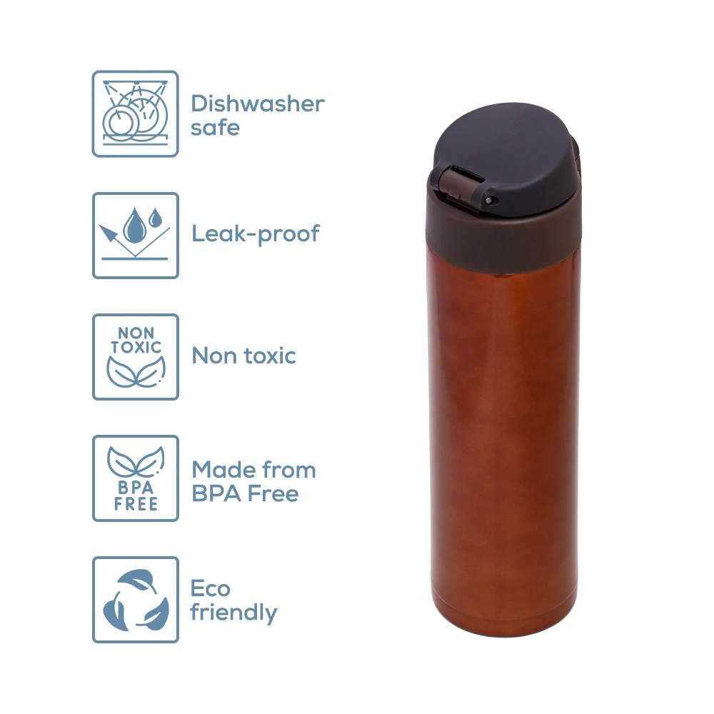 insulated water bottle, copper bottle, 500ml bottle, travel bottle, stainless steel bottle, thermal bottle, leak proof lid, bpa free, phthalate free, flip top lid, reusable bottle, eco friendly, double wall insulation, portable hydration, premium design, easy to carry, stylish water bottle, spill resistant, durable bottle, compact size