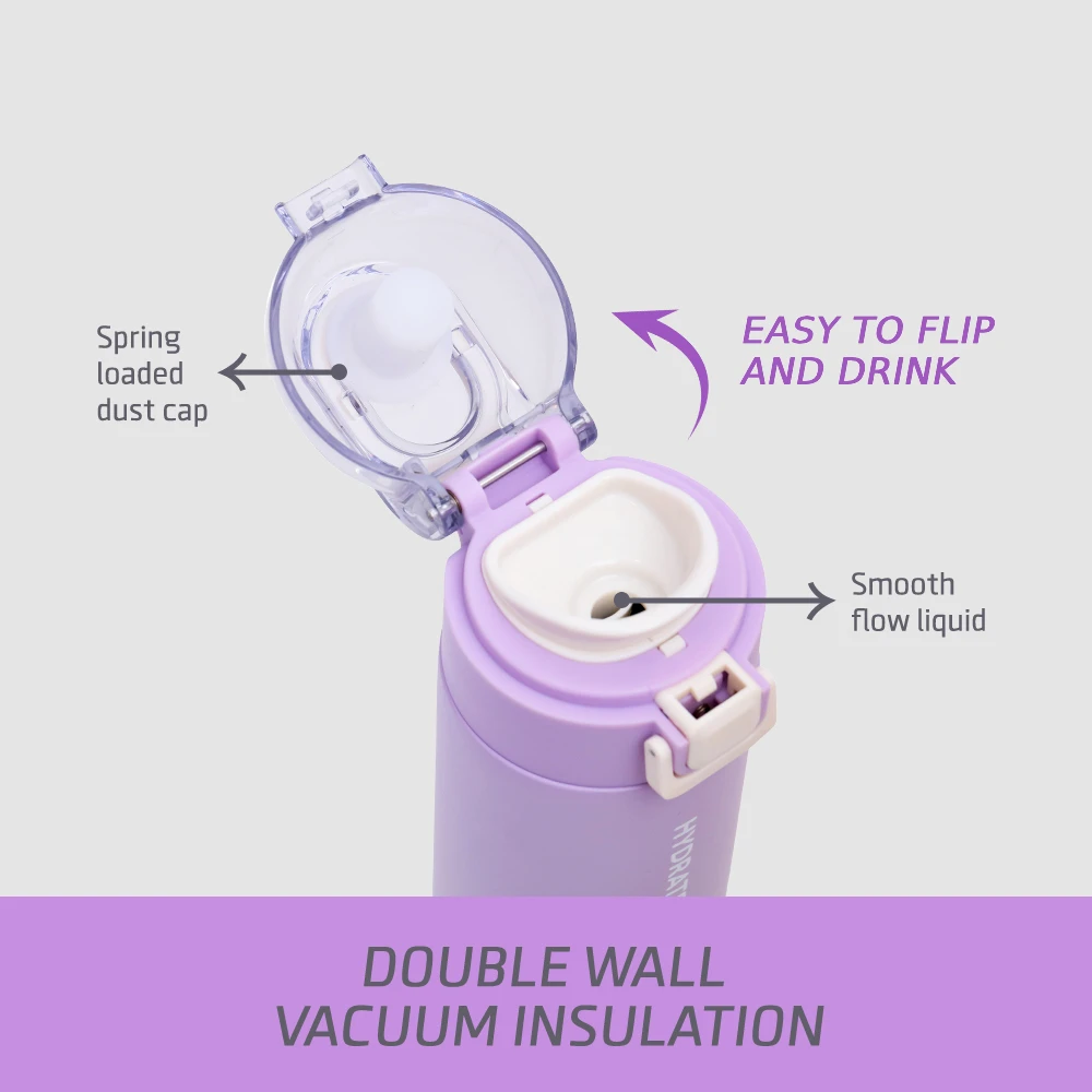insulated water bottle, purple bottle, 550ml bottle, stainless steel, thermal insulation, leak proof, flip lid, one hand sip, food grade material, bpa free, phthalate free, reusable bottle, travel bottle, eco friendly drinkware, durable water bottle, spill proof bottle, wide mouth bottle, compact design, stylish hydration, everyday use