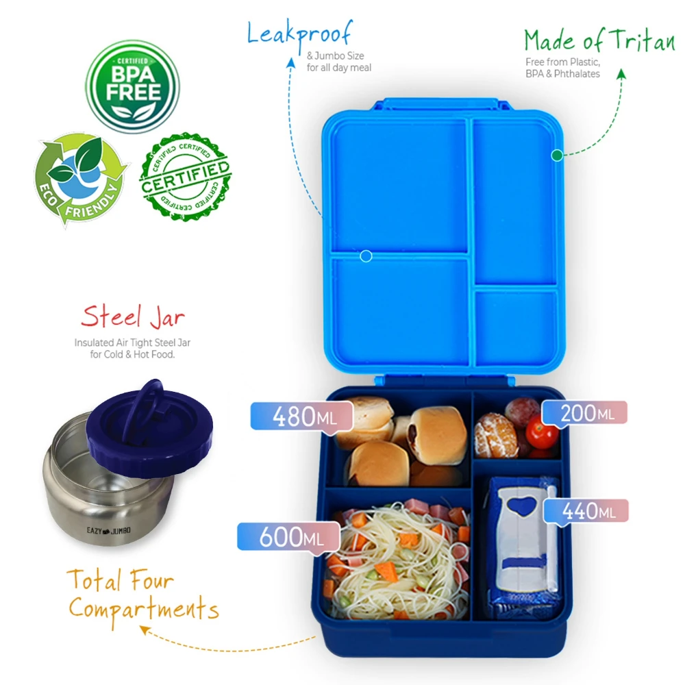jumbo bento lunch box, insulated lunch bag, lunch set with thermos, blue lunch box set, leak proof lunch box, food storage set, eazy kids lunch box, lunch set with dip jar, stainless steel thermos, school lunch essentials, reusable lunch set, multi compartment lunch box, travel lunch set, food safe lunch gear, organized lunch storage, insulated meal bag, premium lunch accessories, durable lunch kit, stylish lunch set, easy clean lunch box