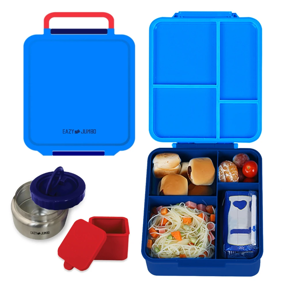 Eazy Kids Jumbo Bento Lunch Box with Lunch Bag, Thermos & Dip Jar - Blue