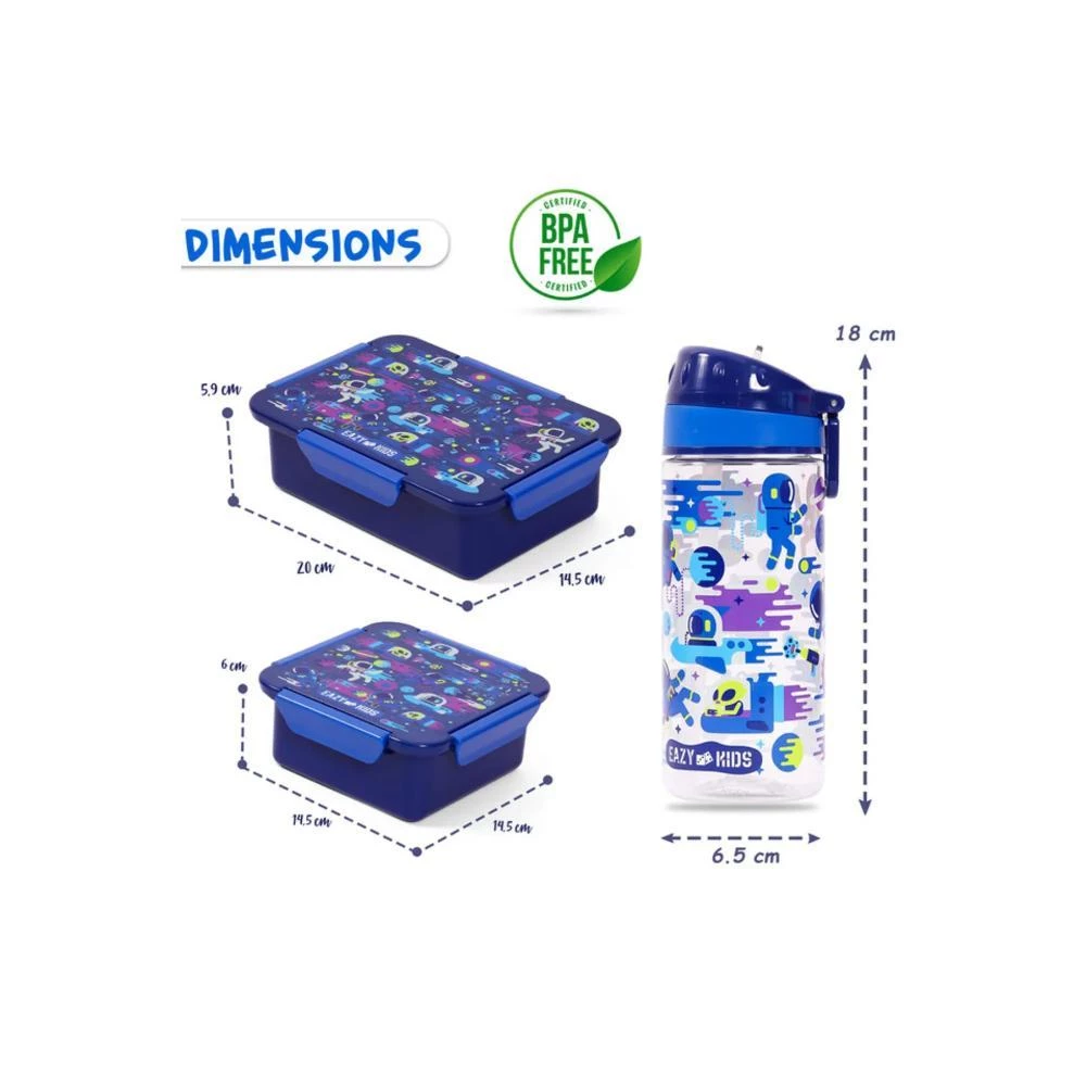 Eazy Kids Lunch Box Set & Tritan Water Bottle with Carry Handle - Astronauts Blue 420ml + 850ml + 650ml Leakproof Kids Meal Kit by SAMBOX