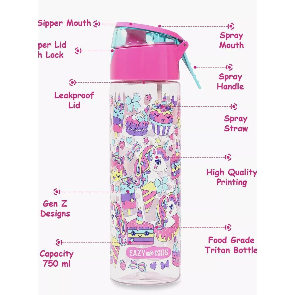 Eazy Kids Lunch Box Set & Tritan Water Bottle with Spray - Unicorn Desert Pink 750ml + 850ml + 650ml Leakproof Kids Meal Kit by SAMBOX