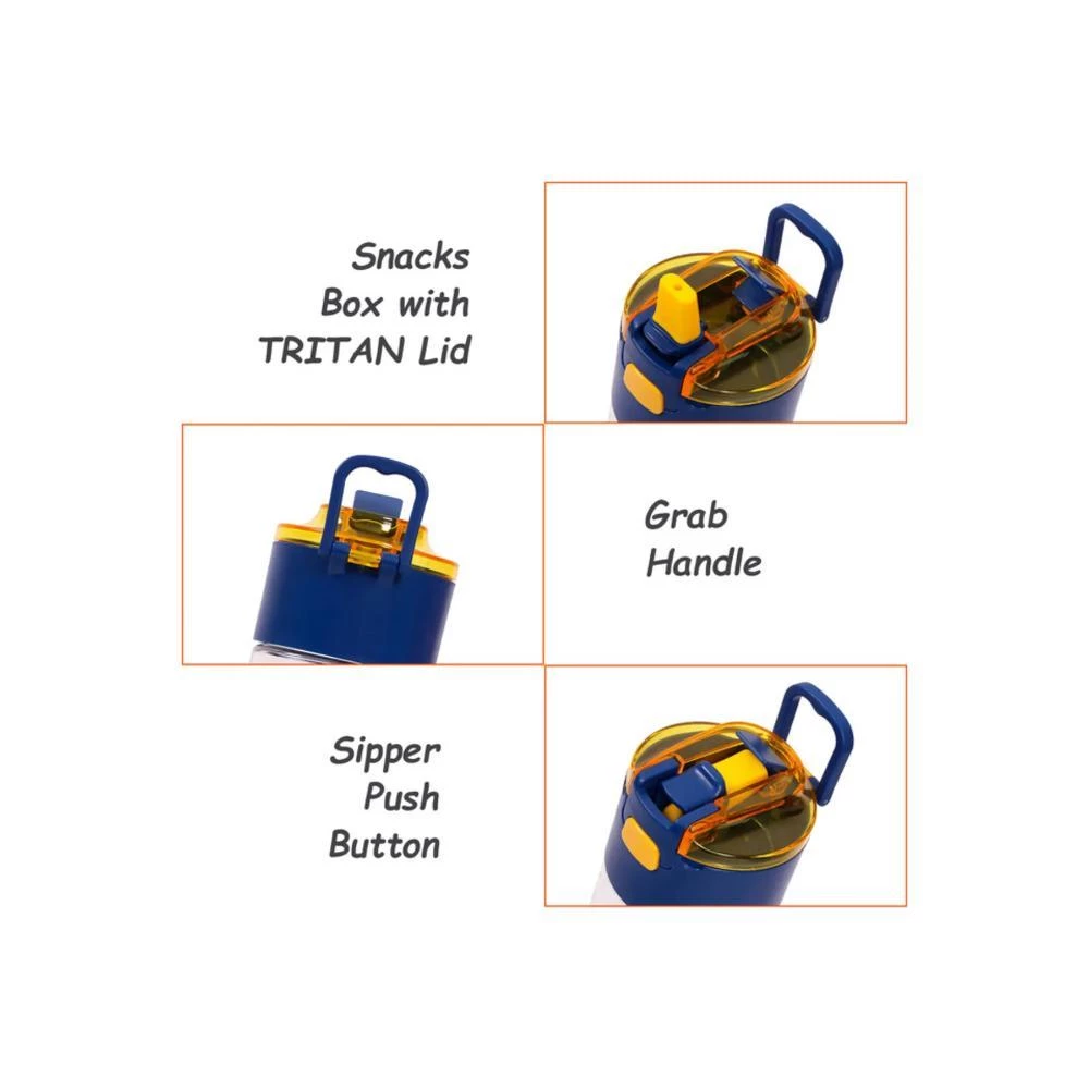 Make meal and hydration time exciting with the Eazy Kids Lunch Box and Tritan Water Bottle with Snack Box - T-Rex Blue Combo by SAMBOX. Crafted from BPA and phthalates-free, non-toxic, food-grade, and eco-friendly materials, this combo is designed for safety and durability. The 450ml water bottle keeps your child hydrated all day and features a handy flip lid snack box, perfect for quick bites on the go. The spacious 850ml lunch box with 4 secure clasp locks and a silicone-lined seal ensures its completely leakproof, ideal for packing balanced, nutritious meals like thick yogurts and dips (avoid liquids and runny foods). Both the water bottle and lunch box are freezer safe (-18°C), dishwasher safe (without lids on the top rack), and the lunch box is microwave safe (without lid, up to 100°C). Lightweight and easy to carry, this matching dinosaur-themed set is the ultimate back-to-school companion for your kids.