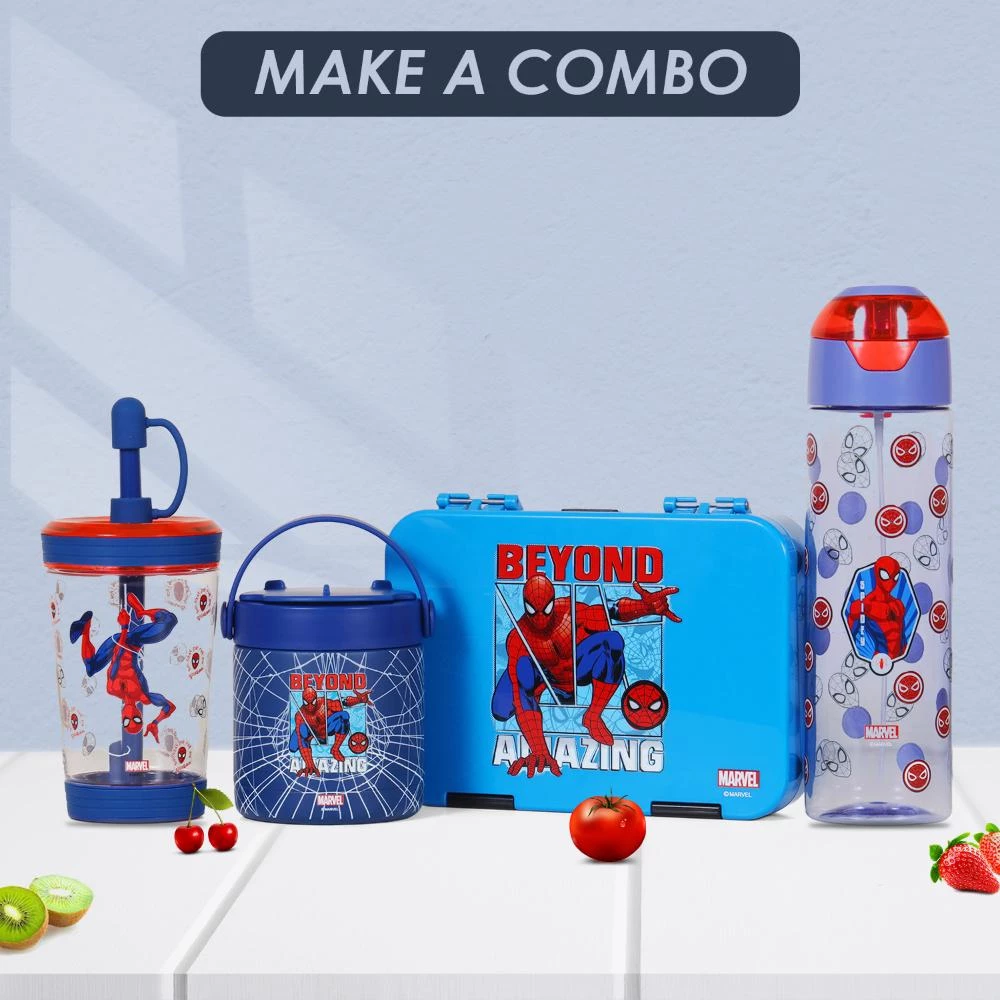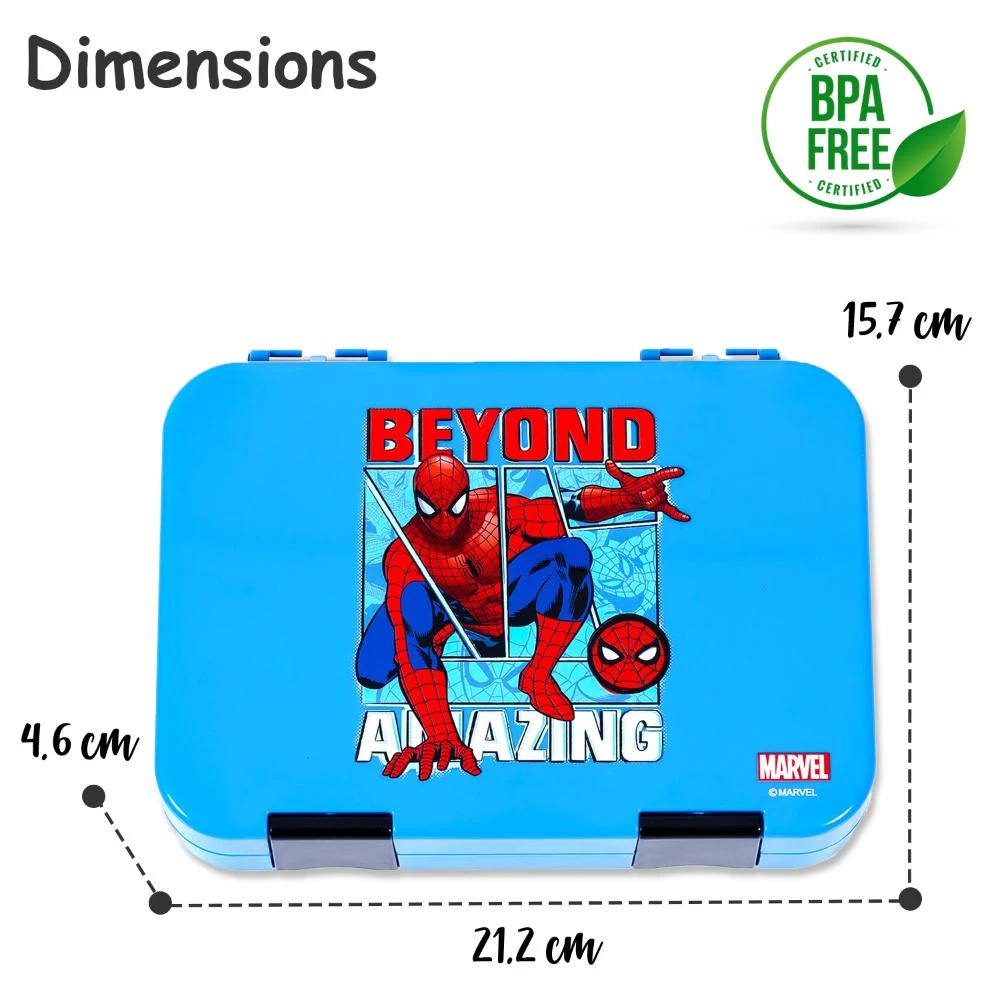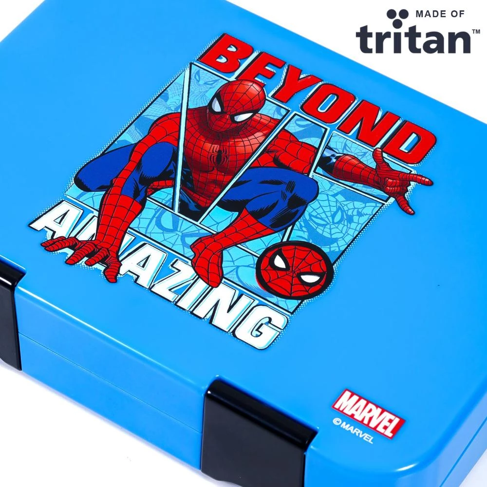 beyond amazing spiderman lunch box, marvel tritan bento box, superhero food container, leakproof kids lunch box, blue lunch tray, 6-in-1 bento box, 4 compartment lunch case, reusable meal box, marvel kids accessories, comic lunch essentials