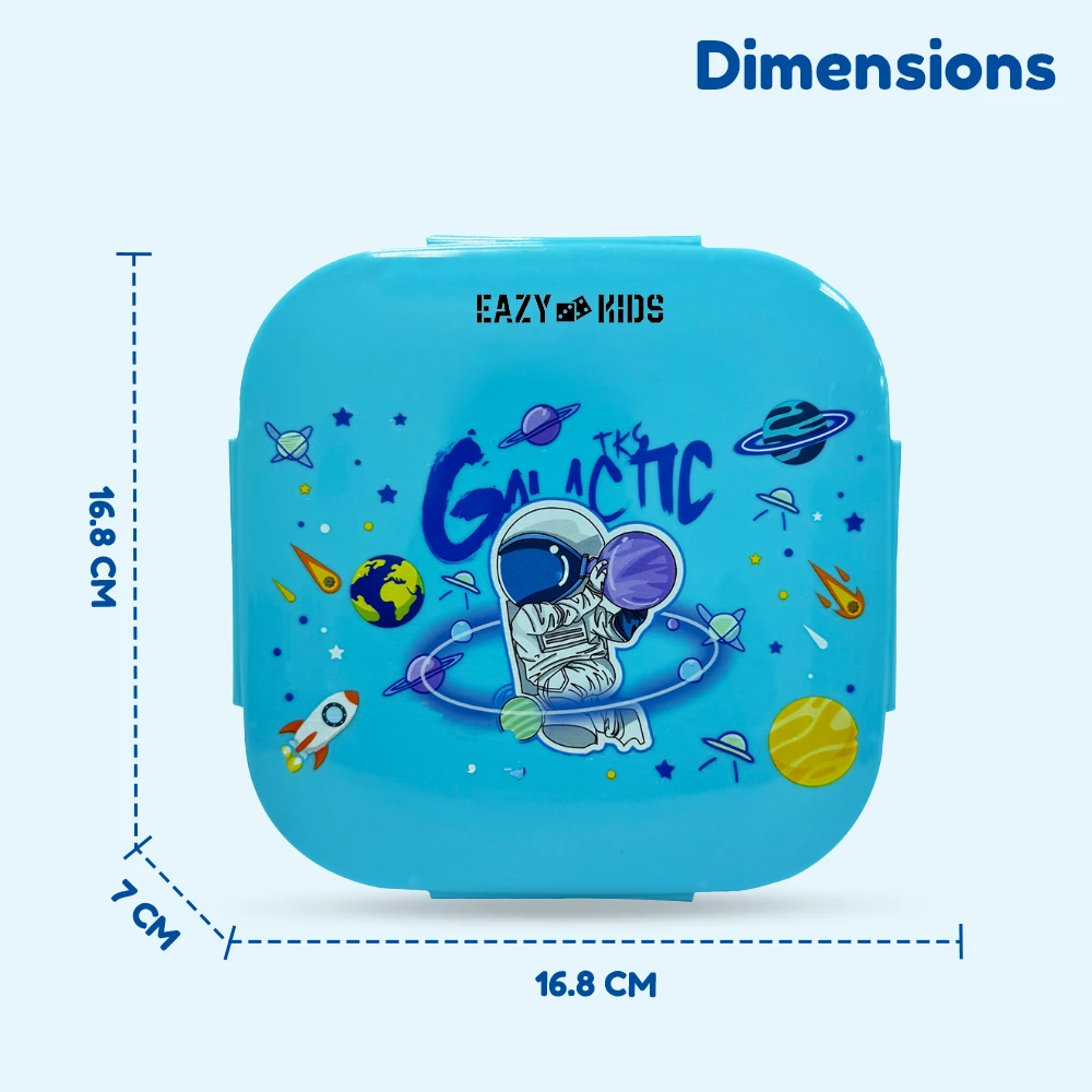 Discover out-of-this-world lunchtime fun with the astronaut-themed Eazy Kids square bento box in cosmic blue. Equipped with three compartments and a leakproof clasp lock lid with silicone lining, it safely separates meals and snacks. The eco-conscious, BPA‑free build includes a spoon and fork and offers easy cleaning. Designed for durability and convenience, it’s an excellent choice for everyday meal packing with a space-inspired twist.