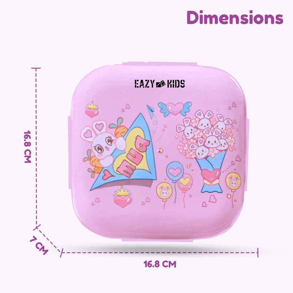 Brighten mealtime with the Eazy Kids square bento box in sweet pink featuring love-themed prints. Boasting three compartments and a silicone-lined, leakproof clasp lid, this lunch box keeps food separated and secure. Made from eco-friendly, BPA‑free material, it also includes a spoon and fork. The compact, lightweight design makes it convenient to carry, clean, and use—ideal for school lunches or travel.