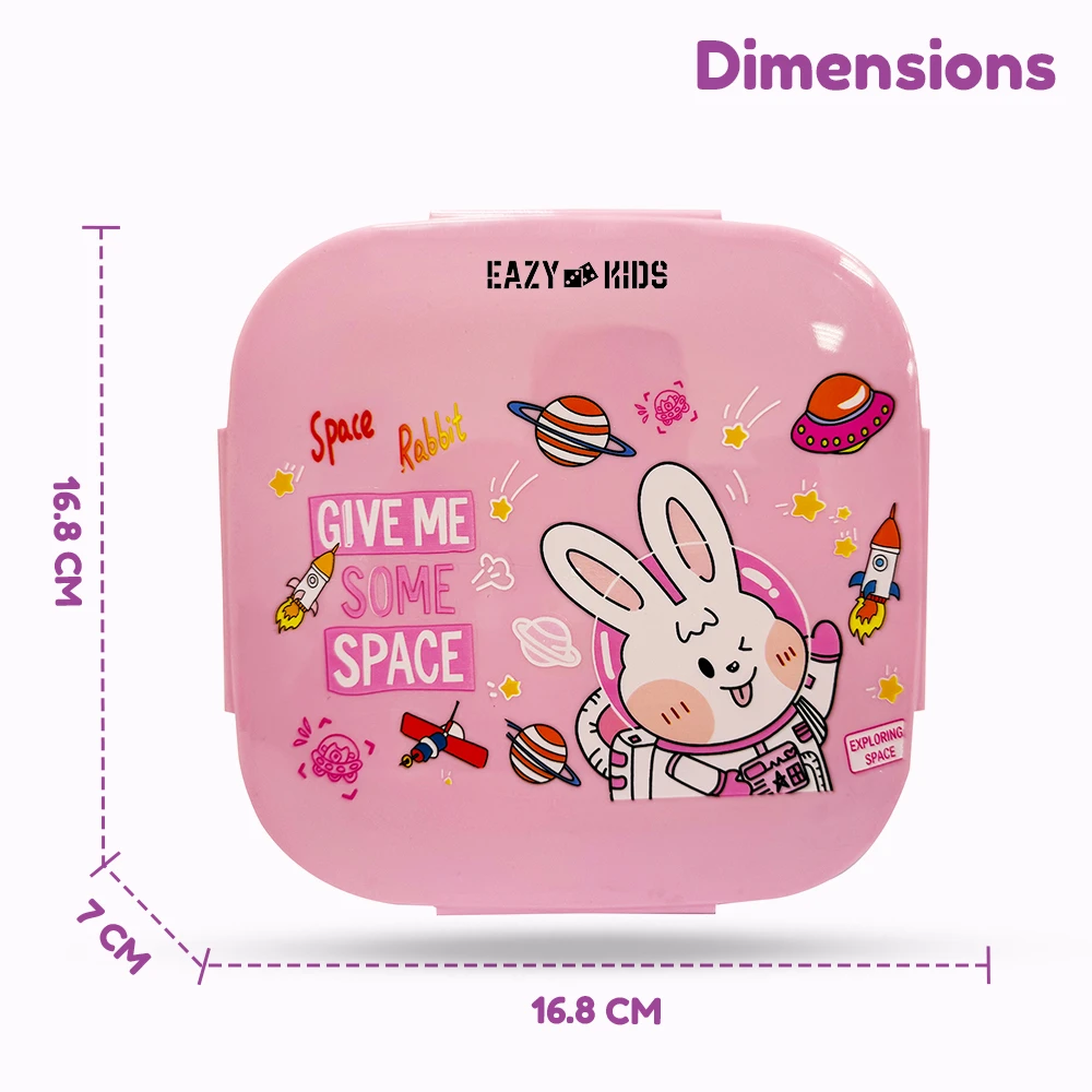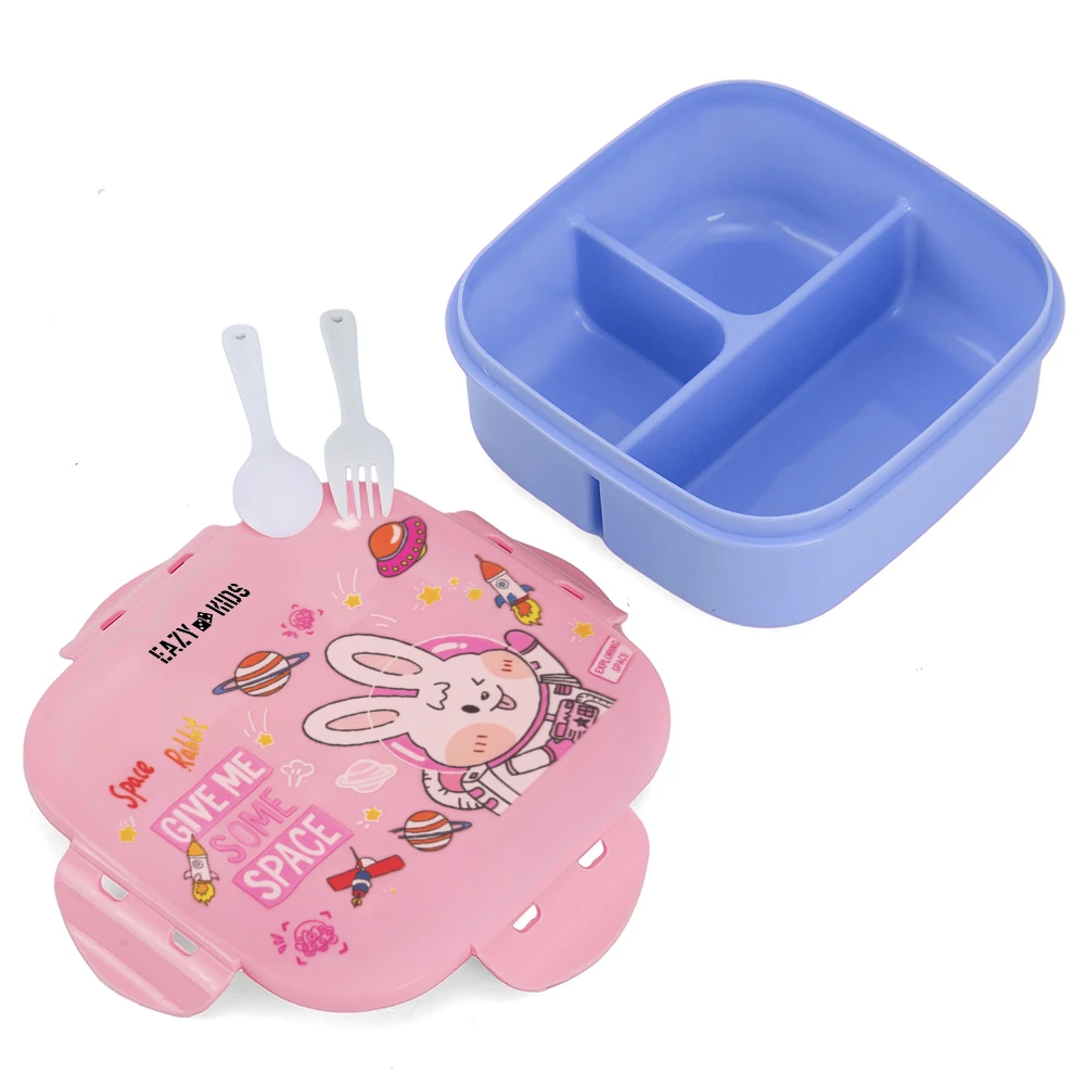 This adorable rabbit-themed Eazy Kids bento lunch box in soft pink includes three thoughtfully designed compartments, a leakproof lid with secure silicone seal and clasp locks, and matching spoon and fork. Made from BPA‑ and phthalate‑free materials that are easy to maintain, it delivers organized meal storage in a lightweight package that's perfect for school or outings.