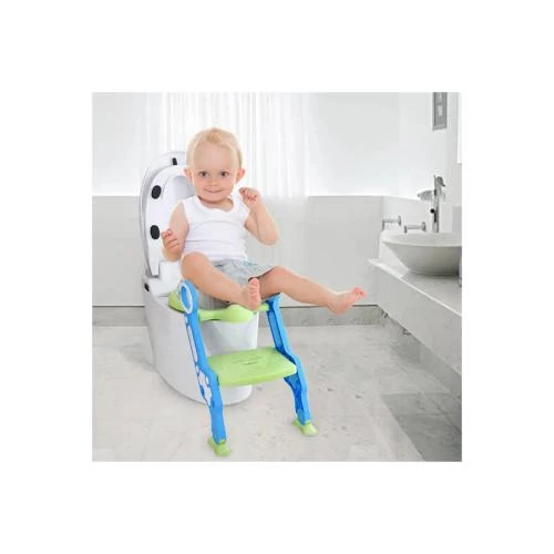 The Eazy Kids Step Stool Foldable Potty Trainer Seat in vibrant Green is an ideal training seat with ladder designed for toddlers and young kids aged 1 to 7 years. Crafted from durable PP material, this potty trainer features adjustable height to fit all standard adult toilets, helping little ones climb up and use the toilet independently with confidence. It includes anti-slip foot pads for secure floor grip and easy-to-grip handles for added safety. The padded cushion offers comfortable seating and is removable for effortless cleaning. Its foldable design allows easy storage when not in use, making it perfect for small spaces and busy households. The package comes complete with a seat, cushion, pedal, supporting legs, screws, and wrench for quick assembly.