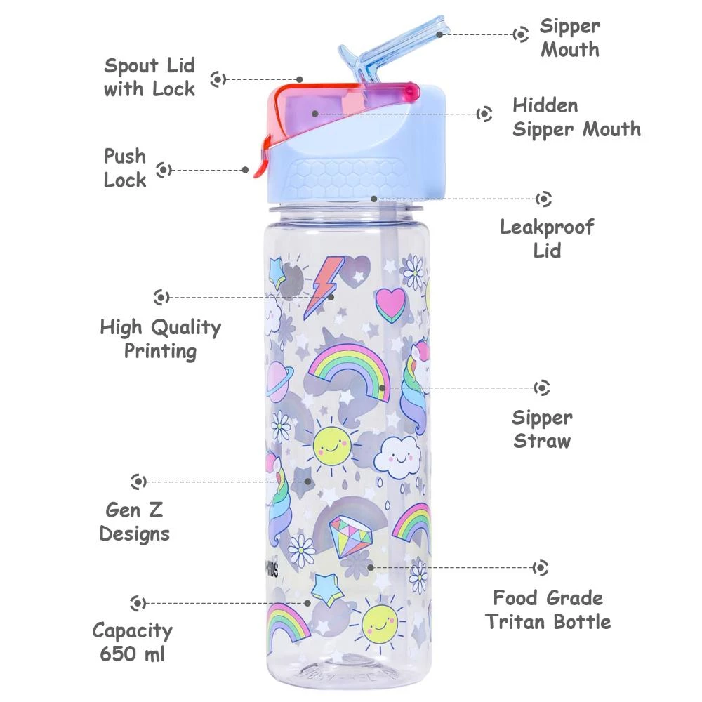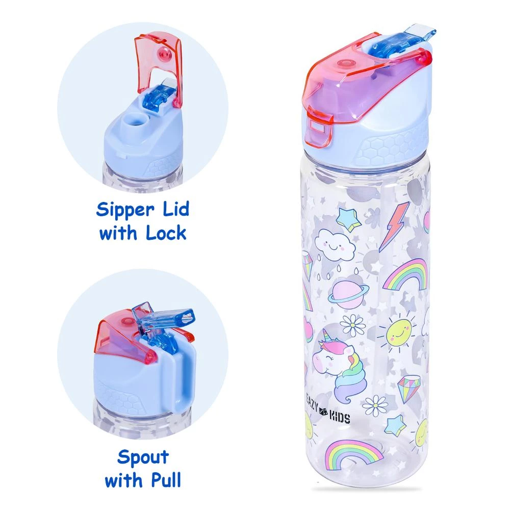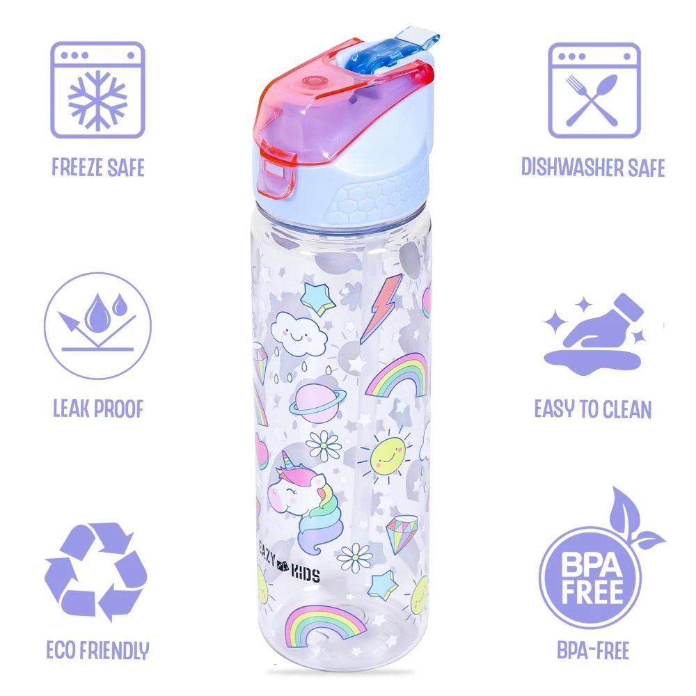 unicorn kids water bottle, tritan water bottle 650ml, 2-in-1 sipper bottle, leakproof kids drinkware, BPA free bottle for school, flip lid bottle, eco friendly water bottle, cute water bottle for girls, Eazy Kids bottle, school hydration gear