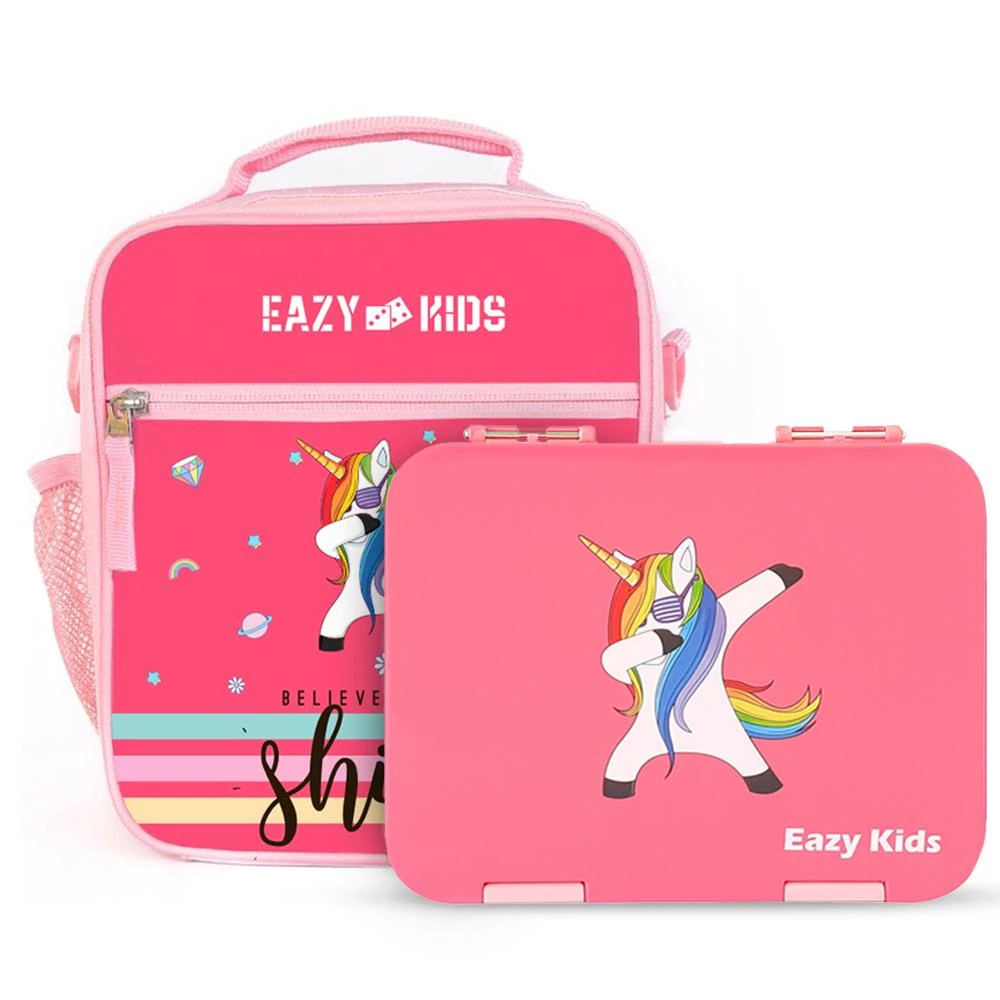 Eazy Kids Unicorn Pink Convertible Bento Lunch Box with 4/6 Compartments and Insulated Lunch Bag