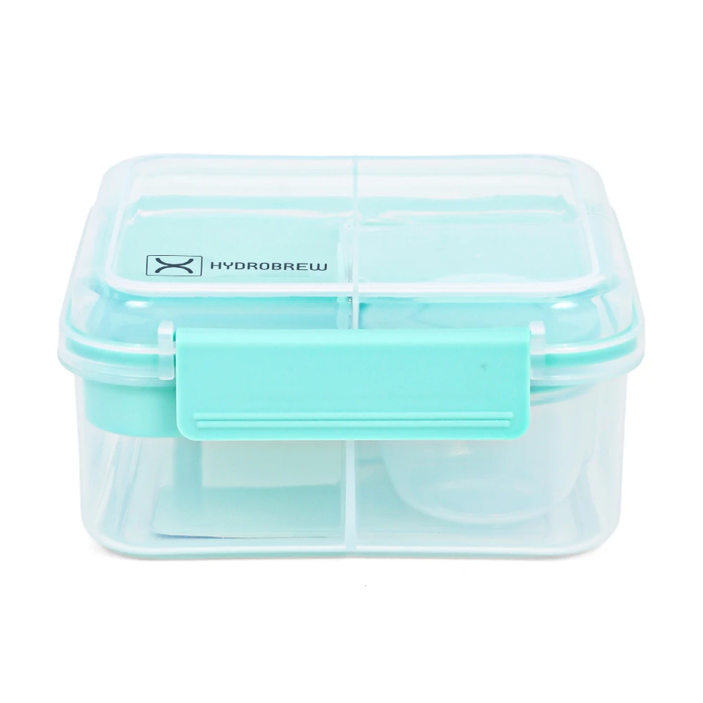 The HYDROBREW green convertible bento lunch box offers flexible meal organization with 3, 4 or 5 compartments to suit varying appetites. Made from BPA- and phthalate-free food-grade materials, it includes a leak-proof stainless steel gravy container and secure silicone-lined clasp locks. The lunch box is safe for freezer use, top-rack dishwasher cleaning, and microwave use when the steel insert is removed. Lightweight and easy to carry, it makes packed meals practical and spill-free. Colorful prints and a grab-handle add both style and portability, making it a top choice for school, work, or outings.