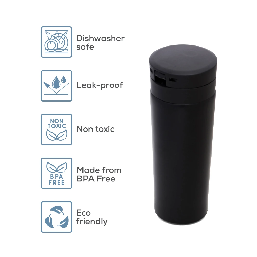 insulated tumbler, black water bottle, leakproof tumbler, double wall insulation, hot and cold bottle, matte black finish, reusable drinkware, vacuum insulated bottle, stainless steel tumbler, portable bottle, travel-friendly bottle, office hydration, spillproof lid, modern water bottle, bpa free construction, durable design, odor free bottle, easy clean tumbler, sleek design bottle, everyday bottle