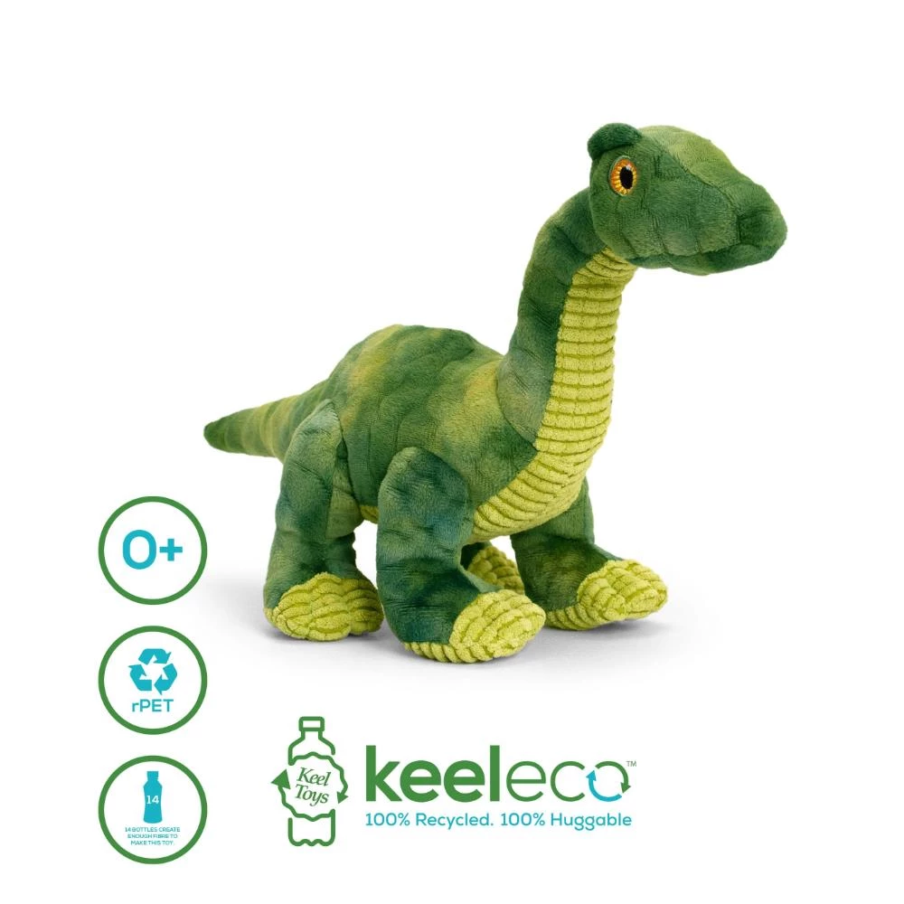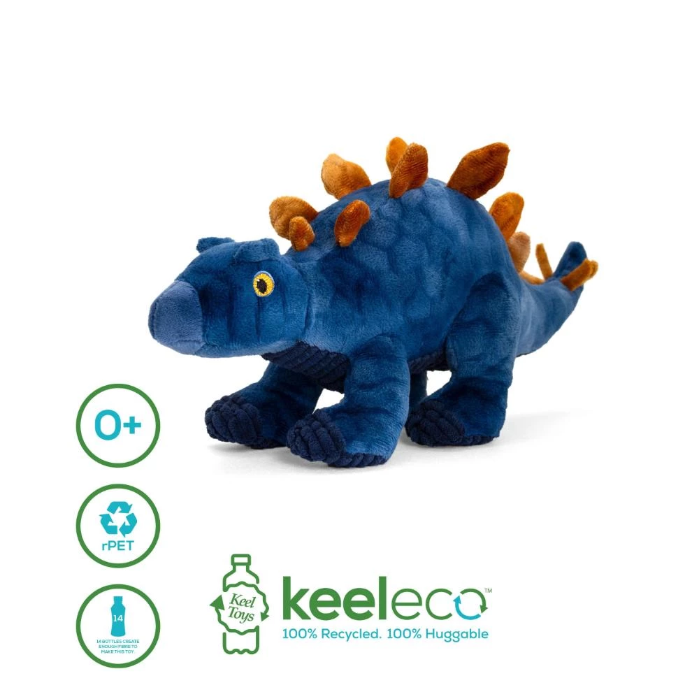 Keeleco dinosaur plush, eco-friendly dinosaur toys, 26cm dinosaur soft toys, recycled dinosaur stuffed animals, Keel Toys UAE, sustainable kids toys, T-Rex plush, Stegosaurus cuddly toy, Keeleco prehistoric collection