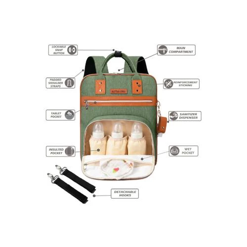 Little Story 2in1 Diaper Bag with Sanitizer Bottle Keychain & Stroller Hooks -Green Stylish Maternity Backpack by SAMBOX