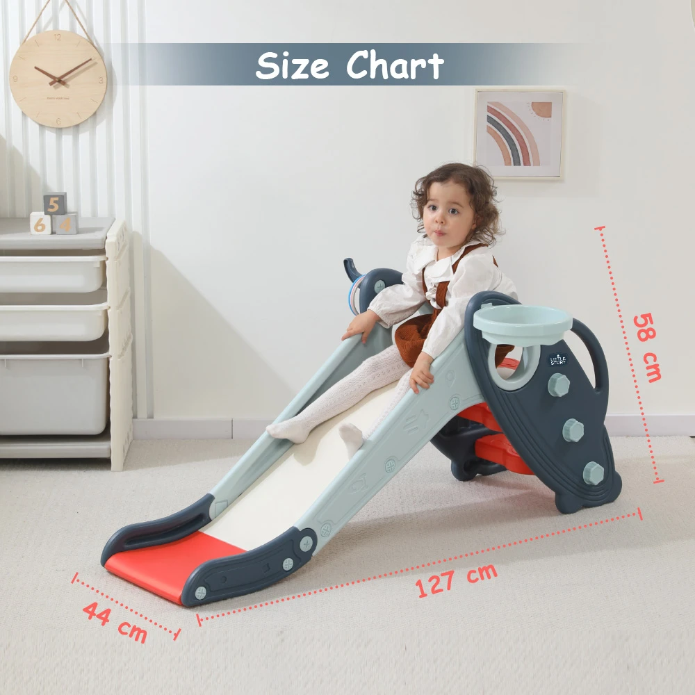 The Little Story 3-in-1 baby slide in blue delivers hours of fun with multiple play options in one compact design. Featuring a smooth slide, a built-in basketball hoop, and an engaging ring toss game, it offers varied activities to keep little ones entertained and active. The slide is designed with gentle slopes and stable steps, making it safe and easy for beginners to enjoy.