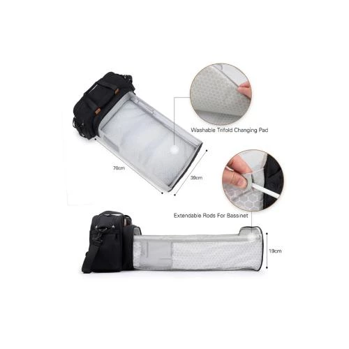 The Little Story Bed in a Bag Quilted in Black by SAMBOX is the ideal travel solution for parents who want comfort and style for their baby on the go. This lightweight and compact bag unfolds into a cozy bed, perfect for outdoor naps or flights with your infant. Made with a durable 300D polyester outer and soft 210D polyester inner, it features a modern self-quilted design with elegant faux leather hardware accents. The bag includes 10 spacious pockets and a wide dual zipper opening for easy access to baby essentials, along with a well-lit honeycomb interior to quickly locate items. It comes with a large diaper changing mat and an extendable rod for bassinet setup. The adjustable padded shoulder strap and faux leather grip handles ensure comfort and sophistication, making it a stylish and functional 15L capacity diaper bag and baby bed combo.