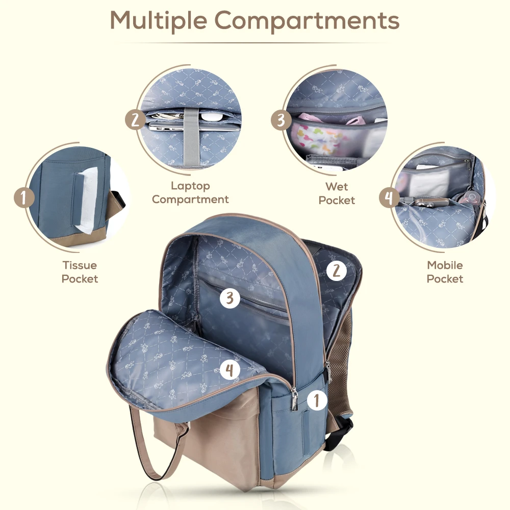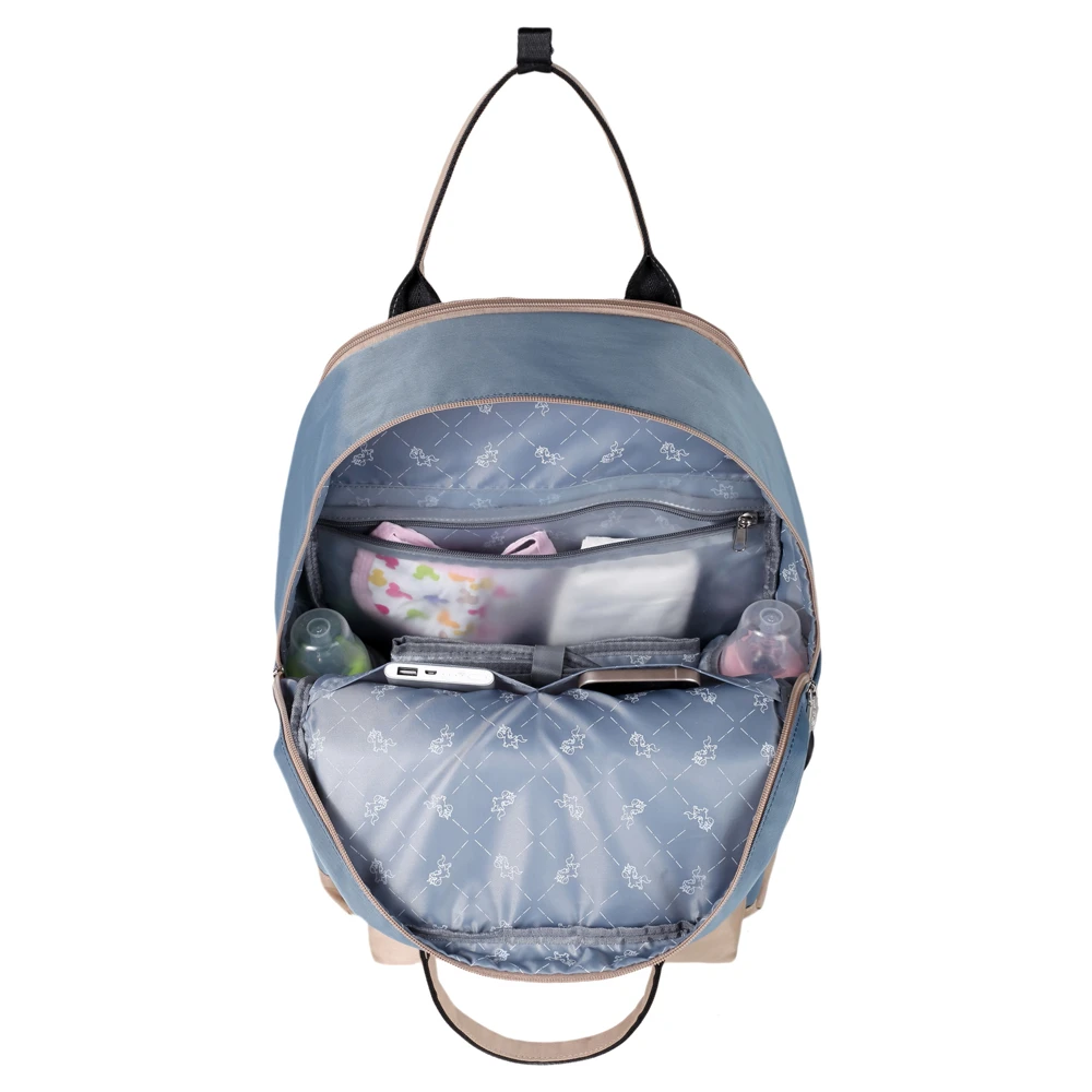 blue diaper backpack, baby travel backpack, mom and dad diaper bag, travel baby bag, water-resistant baby bag, insulated baby bag, little story diaper bag, parenting travel gear, baby bag with organizer, spacious diaper backpack