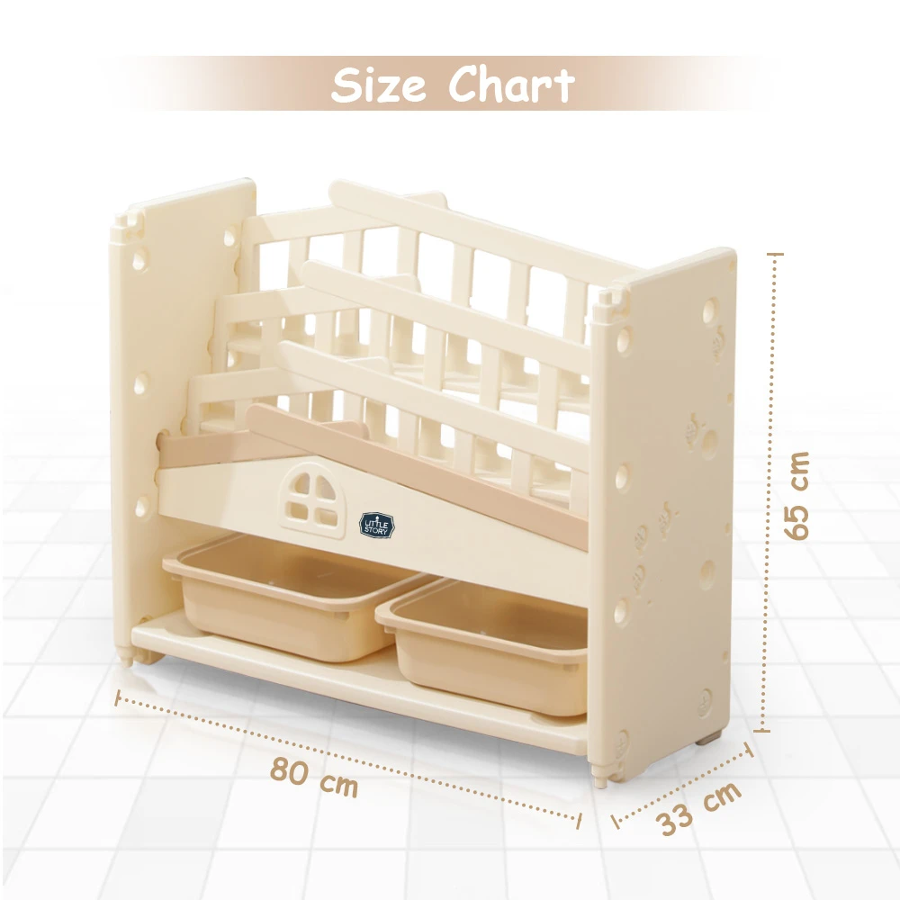 kids bookshelf, white storage shelf, book and toy organizer, little story bookshelf, 2 bin storage, kids room furniture, stylish kids organizer, child safe bookshelf, durable toy storage, functional kids furniture, space saving bookshelf, playroom storage unit, reading corner shelf, multipurpose kids organizer, modern bookshelf design, easy clean storage unit, toy and book rack, home organization for kids, sturdy kids shelf, neutral tone furniture