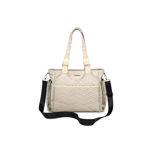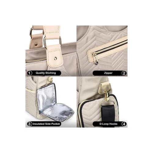 The Little Story Matilda Diaper Bag in Ivory combines elegant style with high functionality, crafted from durable, water-resistant polyester featuring a wipe-clean interior lining. Designed to keep all baby essentials perfectly organized, this spacious bag includes 7 compartments and 11 pockets, with a tin-foiled insulated bottle pocket to keep milk warm or cool. The wide top zipper opening allows easy access while the adjustable and detachable padded shoulder strap ensures comfortable carrying. This bag comes with a luxury large machine-washable padded changing mat, perfect for diaper changes on the go. Additional features include an anti-skid base panel for stability and dirt resistance, sturdy zippers, and beautiful faux leather hardware accents, making it a stylish and practical choice for parents.