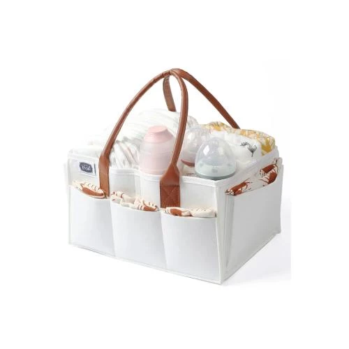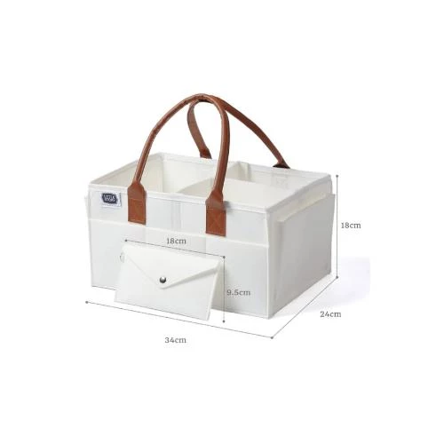 white diaper caddy with pouch, baby organizer with travel pouch, felt diaper storage basket, medium diaper caddy white, vegan leather baby caddy, portable baby storage bag, travel diaper caddy, nursery caddy organizer, foldable diaper tote, baby essentials organizer