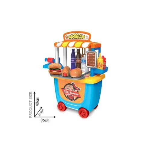 bbq toy cart for kids, pretend play food cart, kids role play kitchen set, 33 piece cooking toy set, blue food cart toy, imaginative play for toddlers, kitchen station toy, little story food cart, toy grill set, educational role play toy