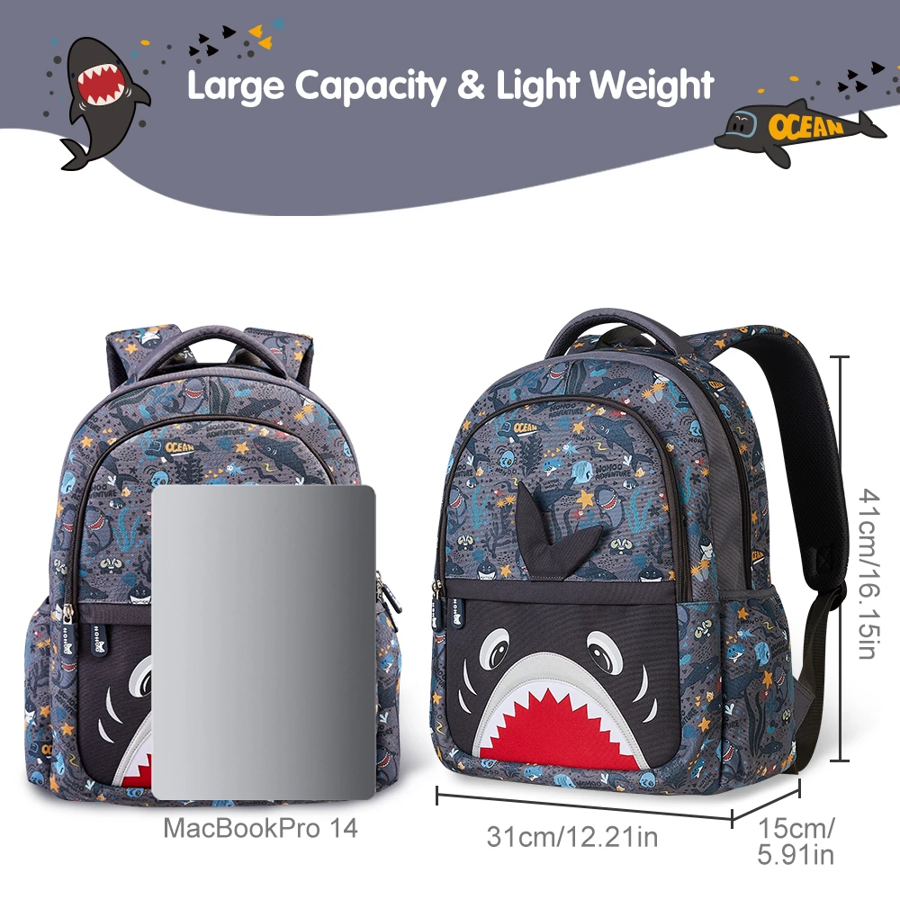 school backpack, shark design, grey bag, 16 inch backpack, water resistant, lightweight bag, nohoo backpack, durable material, front zipper pocket, side mesh pockets, easy to clean, ergonomic design, padded straps, cushioned back panel, adjustable shoulder straps, fun design backpack, organized storage, bold style, novelty backpack, everyday backpack