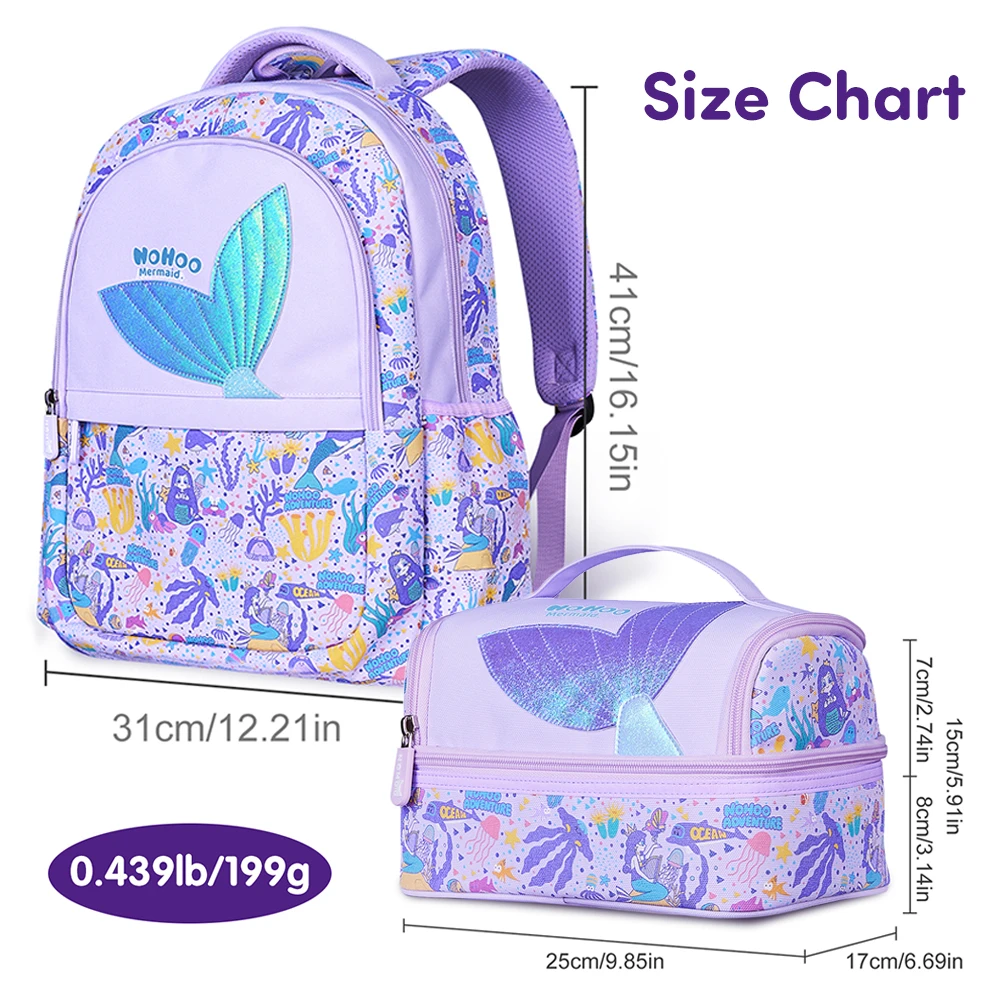school bag combo, mermaid design, purple backpack set, 16 inch backpack, insulated lunch bag, water resistant, padded shoulder straps, cushioned back panel, spacious compartments, easy to clean, lightweight material, nohoo mermaid set, coordinated school set, zipper closure, durable fabric, functional school gear, magical design, school organization, novelty school combo, everyday backpack set