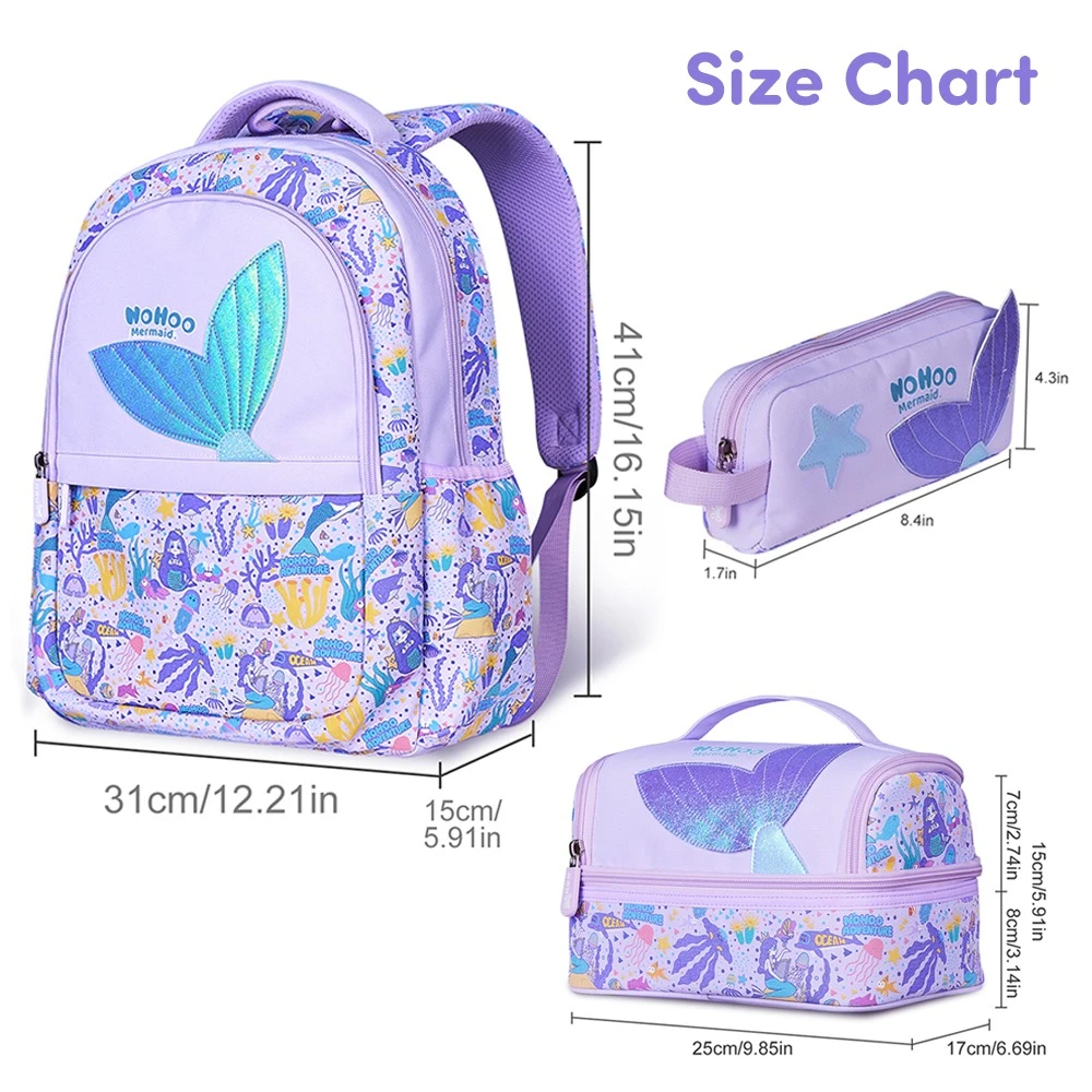 school bag set, mermaid design, purple backpack combo, 3 piece school set, lunch bag included, pencil case included, cushioned back, padded straps, insulated lunch bag, nohoo mermaid set, water resistant, novelty backpack, coordinated school gear, organized compartments, school essentials set, stylish design, zipper closures, durable materials, lightweight school combo, kids stationery pouch