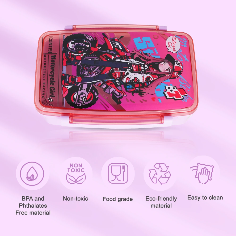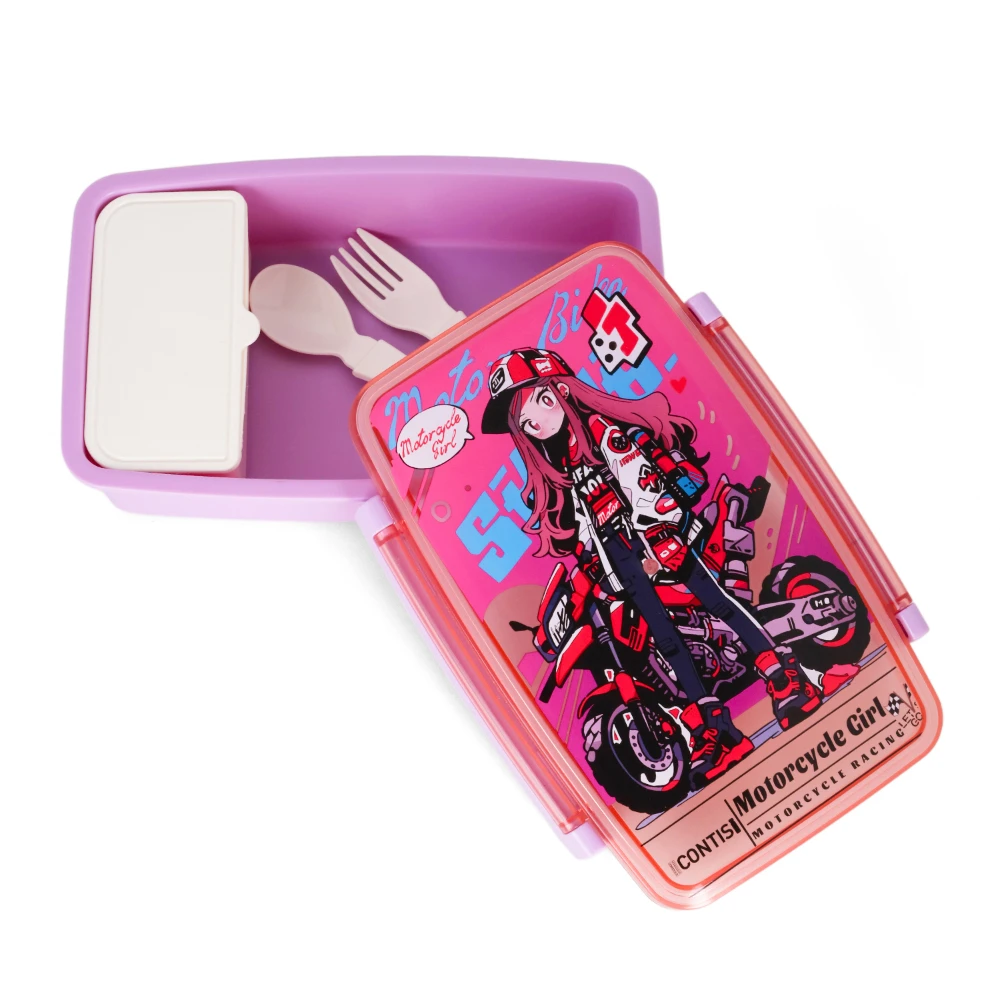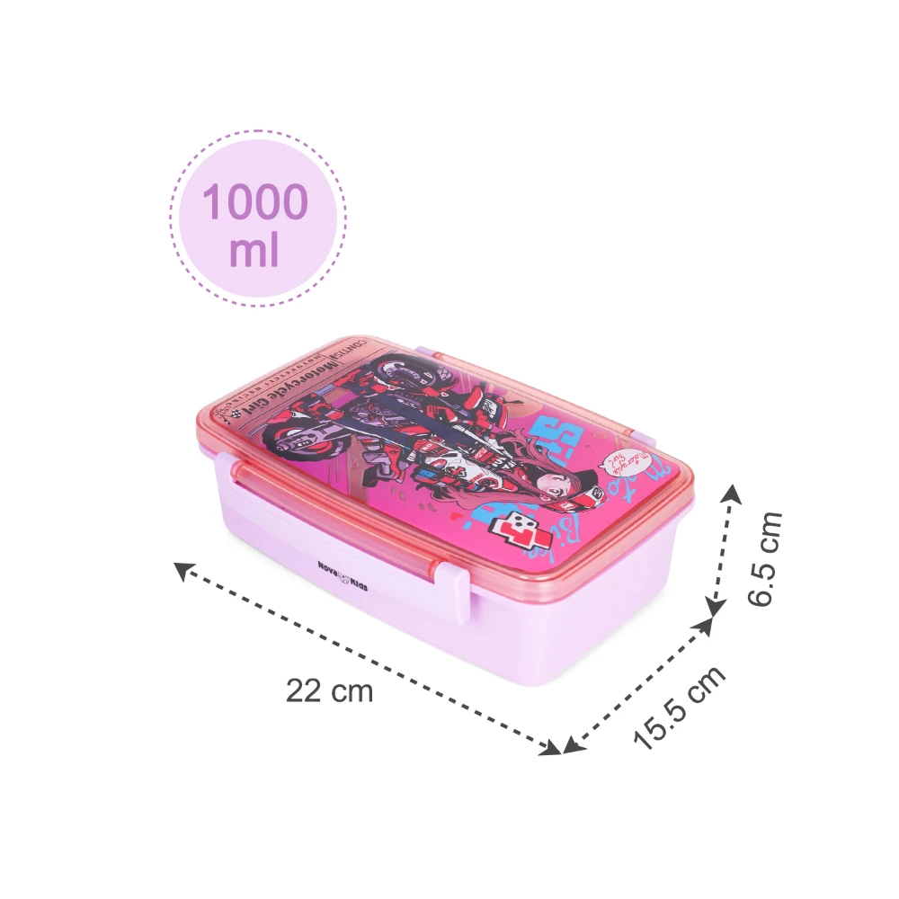 bento lunch box, motorbike pink design, kids lunchware, reusable lunch box, lunch box with spoon, lunch box with fork, food-safe plastic, lunch box with compartments, stylish meal box, leak-resistant closure, nova kids container, school lunch box, compact bento tray, durable food storage, easy to clean, colorful kids lunch box, cutlery included, lunch bag companion, organized lunch solution, motorbike themed box