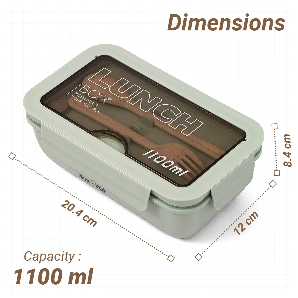nova kids lunch box, green lunch box, square lunch box, leakproof lunch box, food safe lunch box, bpa free, bps free, meal prep container, divided lunch box, reusable lunch box, kids lunch box, school food container, easy clean box, clasp lock lunch box, lightweight lunch box, spoon and fork included, colorful lunch box, balanced meal box, durable lunch box, compact lunch box