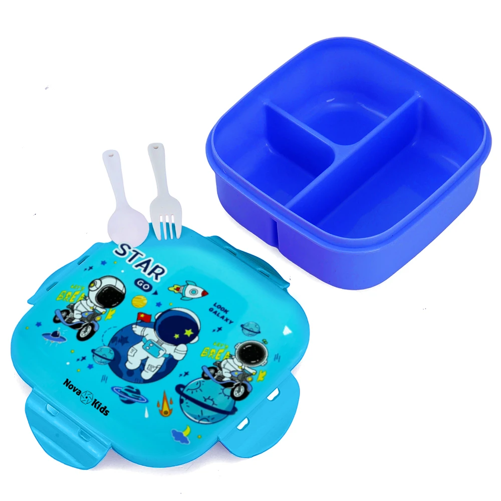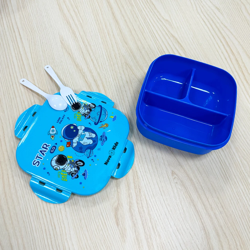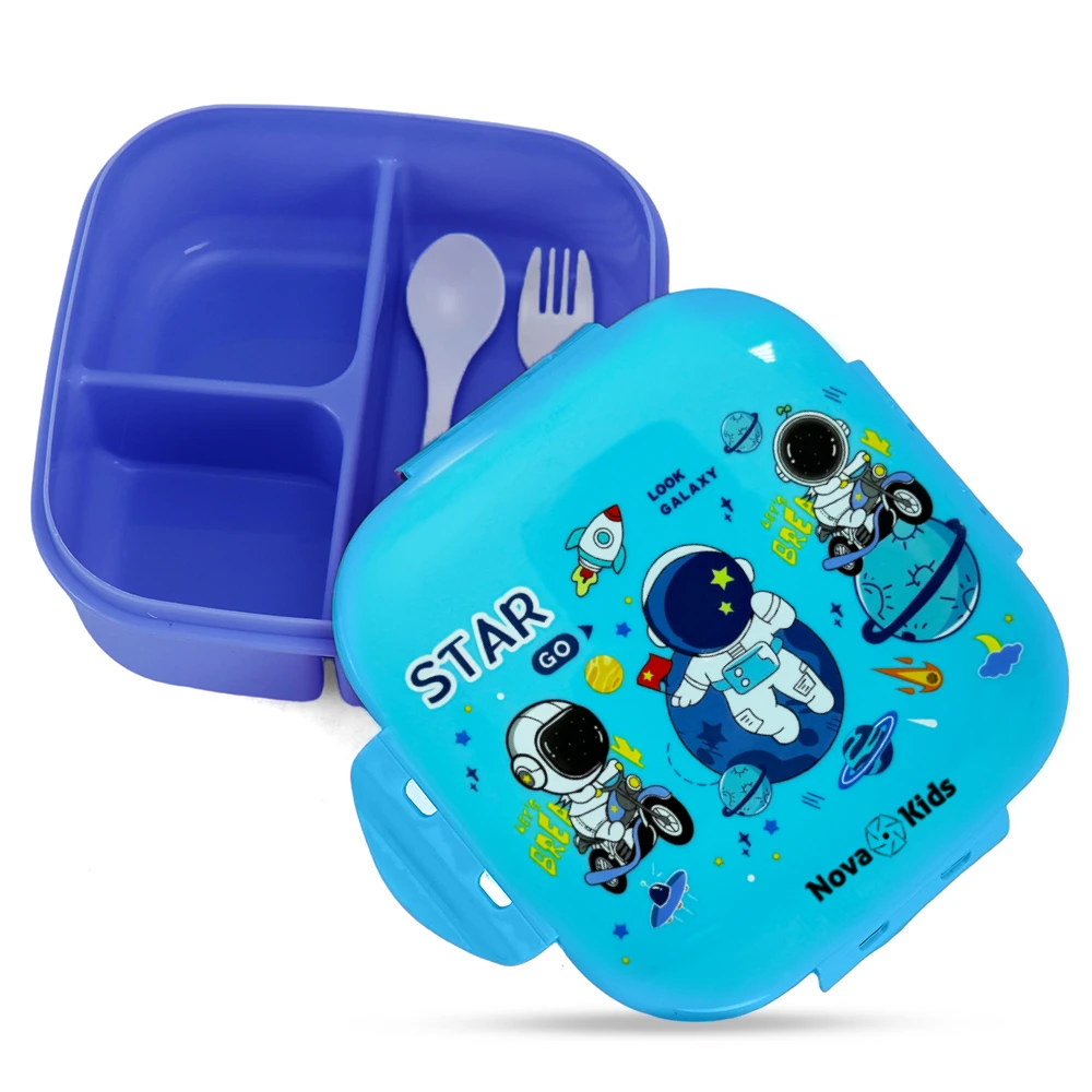 bento lunch box, galaxy blue, 1000ml box, square lunch container, three compartments, spoon and fork included, food safe material, bpa free, phthalate free, leak resistant, silicon lined lid, lightweight, washable box, school lunchbox, reusable bento box, durable container, space theme design, fun lunch kit, compact transportable box, balanced meal organizer