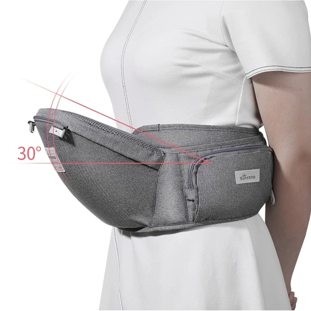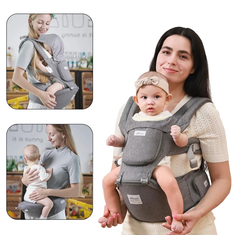 baby carrier with hip seat, ergonomic baby carrier, sunveno carrier, grey infant carrier, hands-free baby carrying, breathable baby carrier, hip seat support, comfortable babywearing, adjustable baby carrier, padded shoulder baby carrier