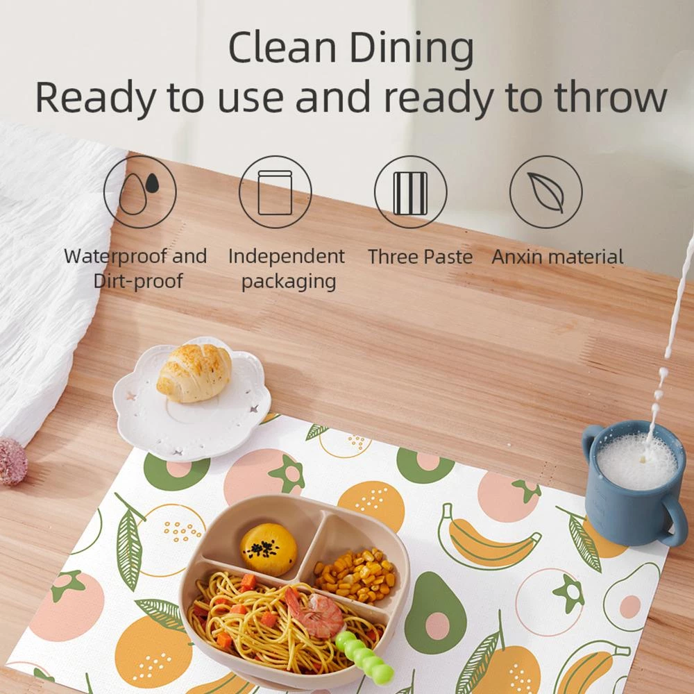 Make mealtimes cleaner and stress-free with the Sunveno Baby Feeding Disposable Travel Multipurpose Placemats - 40 Pcs Pack. Each placemat is designed with a 3-layer structure combining soft non-woven fabric, a water-absorbing polymer, and a waterproof PE layer to absorb spills and keep dining surfaces clean. Made from food-grade, BPA-free PE with inkless printing, theyre completely safe and odorless for daily use. The built-in adhesive strips stick securely to tables or highchair trays to prevent slipping and tearing. Individually packaged for hygiene, these placemats are portable and easy to use at home, in restaurants, or while traveling. Just peel, stick, and remove with no mess or residue left behind.