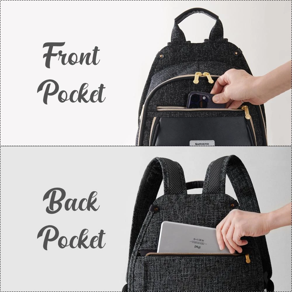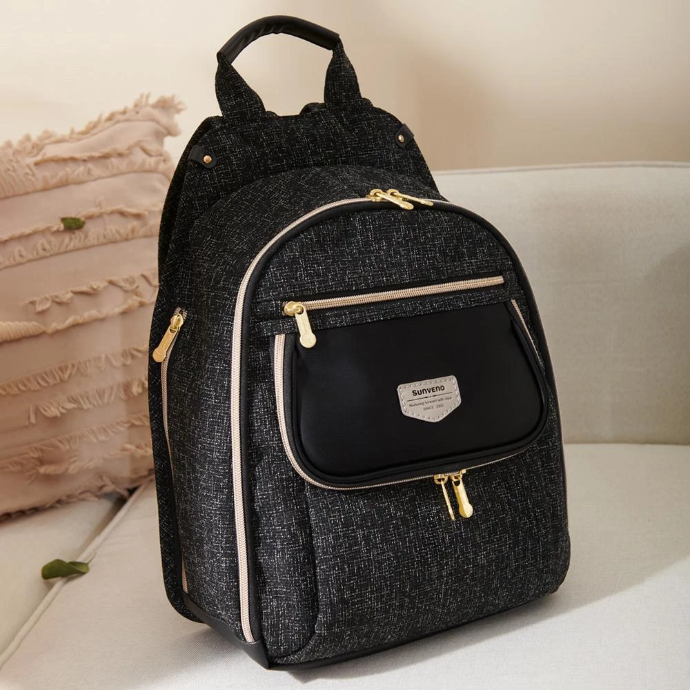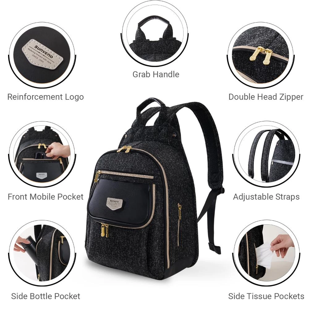 black diaper bag, compact baby backpack, Sunveno baby bag, maternity diaper backpack, stylish diaper bag, baby gear organizer, waterproof diaper backpack, functional baby bag, travel diaper bag, modern baby accessories