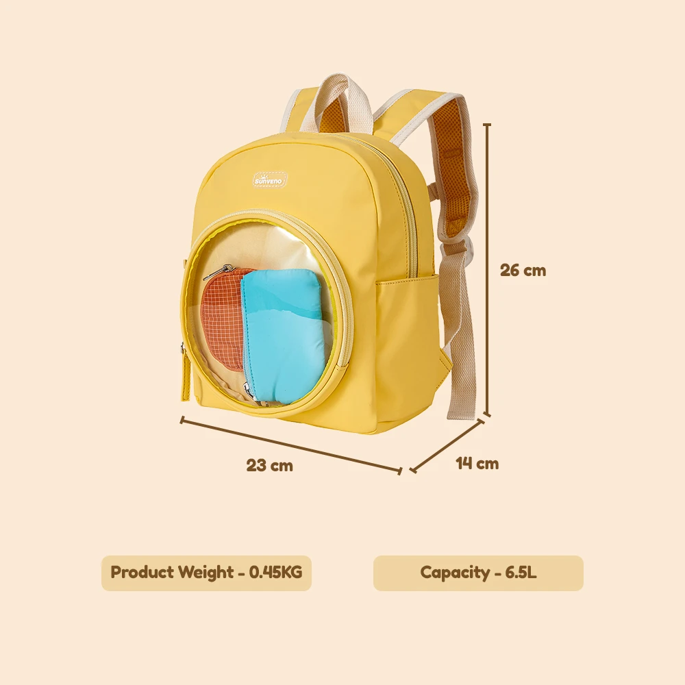 The Sunveno 11‑inch kids backpack in vibrant yellow blends high visibility with sturdy build quality. Made from water-resistant PU-polyester material, it resists everyday wear and tear while remaining simple to clean. A transparent round front compartment offers quick access and playful visibility, while interior and side pockets help keep essentials organized and ready to go. Padded shoulder straps made from breathable mesh deliver all-day comfort, and supportive spine cushioning ensures balanced weight distribution. Added features like two exterior zipper pouches and a chest buckle for trolley attachment emphasize functionality and convenience. From school days to family outings, this stylish yellow backpack offers reliability, comfort, and cheerful design.