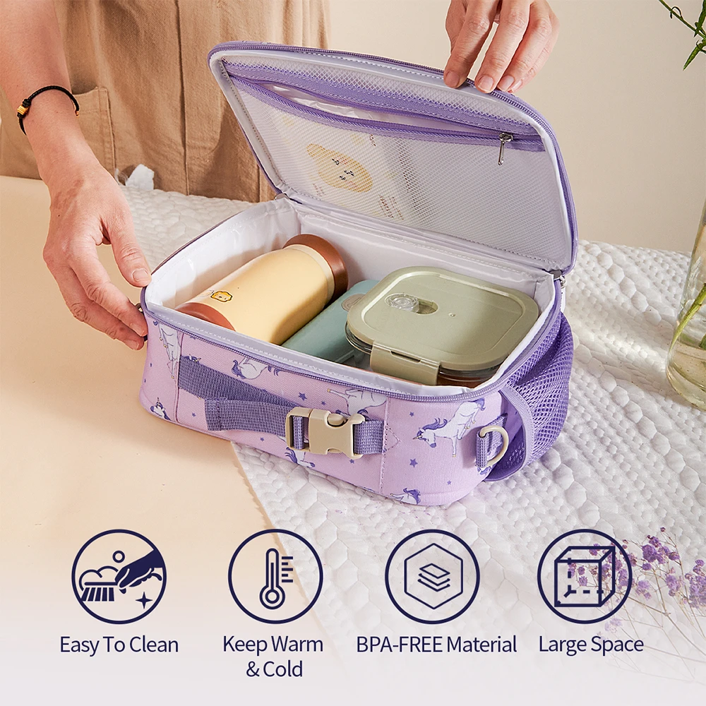 The Sunveno unicorn purple lunch bag brings a dash of fantasy to everyday meals. Its magical unicorn print is paired with insulated inner lining to keep meals fresh and organized. Built for daily use, the exterior is resistant to splashes and dirt, while the interior is easy to clean and designed for optimal food storage. Whether it's lunch, snacks, or drinks, this bag carries it all with style.