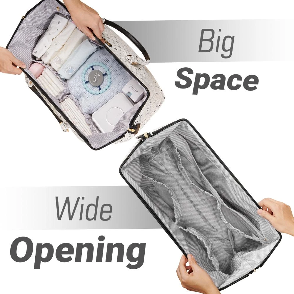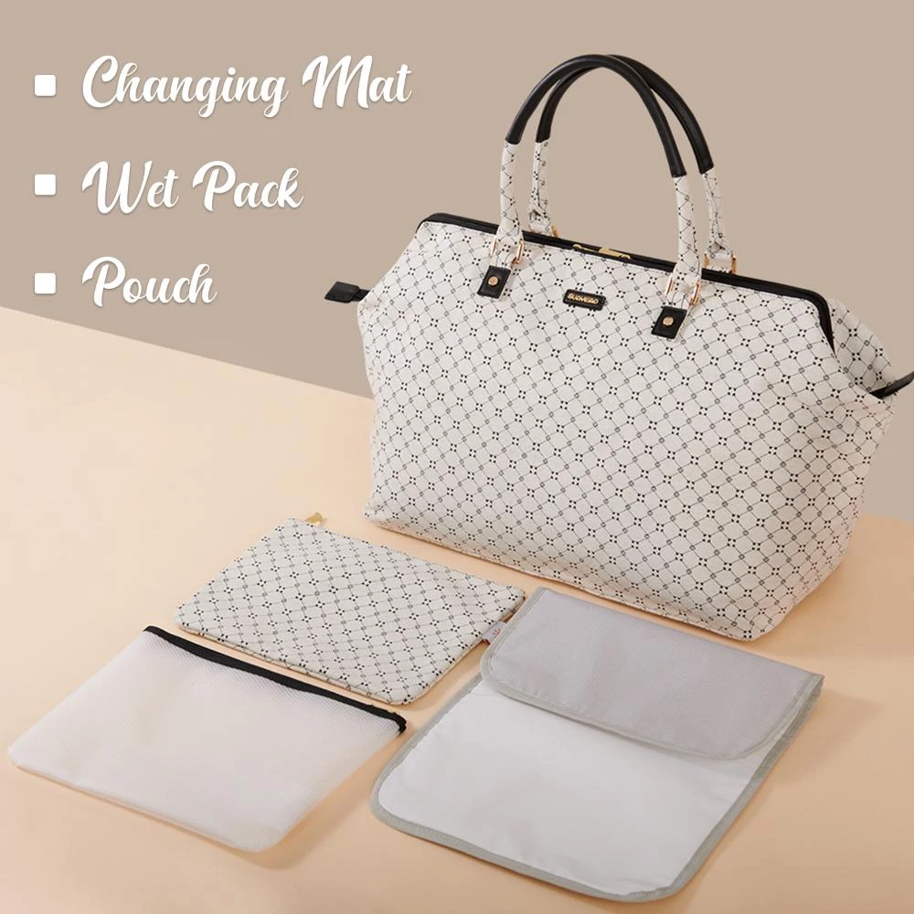 The Sunveno Mommy Fashion Diaper Bag in White is a luxurious and versatile accessory for moms who want elegance and efficiency in one design. With multiple interior compartments, a wide top opening, and a structured bottle chamber, it provides ample space and visibility for everything you need to carry. The fabric is waterproof, dirt-repellent, and exceptionally durable, while high-quality stitching and metal zippers add a premium finish. This all-in-one diaper bag includes a large changing mat, a wet bag for soiled clothes or towels, and a compact storage pouch. The side pocket for wipes is protected with a zipper and features an internal dispenser slot for fast access. With its detachable stroller hooks and multifunctional styling, this bag can easily be used as a handbag, gym bag, or weekender. It’s the perfect balance of fashion and practicality for moms on the move.