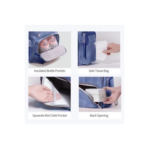 Experience premium style and ultimate convenience with the Sunveno Vogue Diaper Bag in Blue by SAMBOX. Crafted from beautifully woven tweed fabric, this fashionable and durable diaper backpack features vegan leather handles and high-quality steel zippers for a chic look. The wide-mouth fish-mouth design allows easy single-hand access to a spacious interior lined with designer fabric. It includes dual spill-proof insulated bottle holders that keep milk warm or cold for 2 to 4 hours, side pockets for water bottles and tissue packets, and a unique tissue/wipes holder for quick access. An anti-theft pocket and back opening offer added security and convenience. Ergonomically designed shoulder straps ensure comfort during wear, while steel D-loop buckles allow easy attachment of stroller hooks. Lightweight yet spacious, this bag is perfect for stylish moms on the go and pairs perfectly with Sunveno essentials like portable bottle warmers and diaper changing kits.