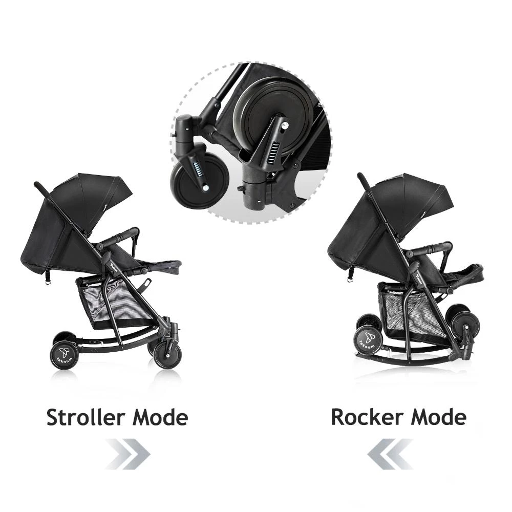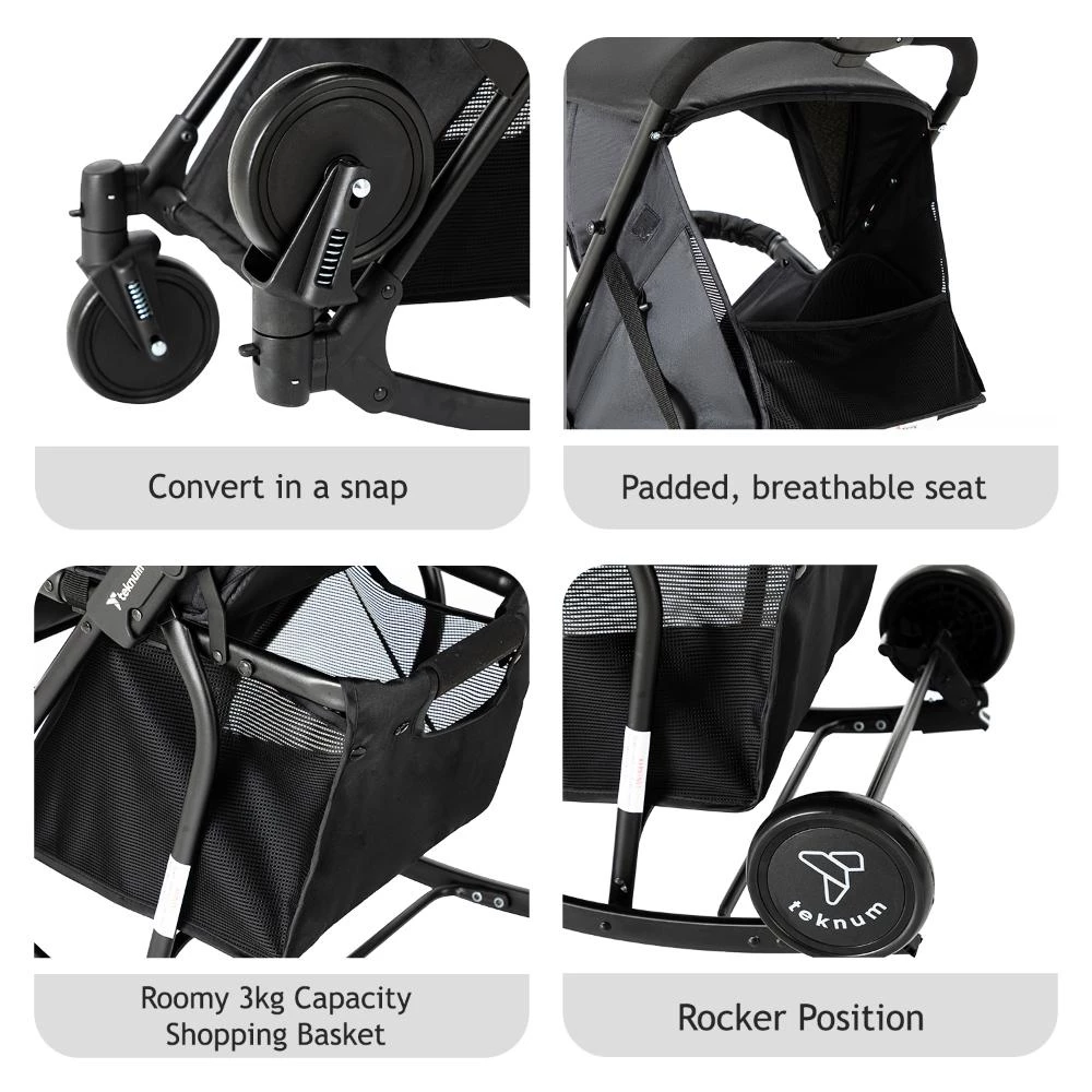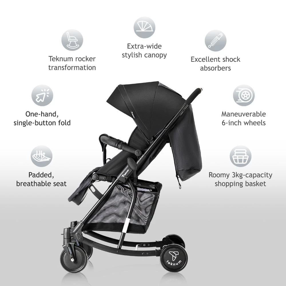 2-in-1 stroller with rocker, compact fold stroller, TEKNUM glide stroller, black baby stroller, stroller with canopy, reclining baby stroller, travel stroller with basket, convertible stroller, stroller with shock absorbers, portable baby pram