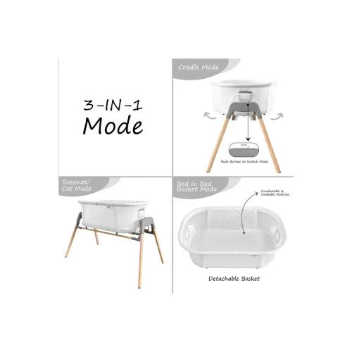 The Teknum 3-in-1 Baby Rocker Bassinet/Infant Crib with Mosquito Net in elegant white by SAMBOX offers a multifunctional solution for newborn sleep and comfort. Designed to be used as a Cradle Rocker, Cozy Napper Cot, or Bedside Crib, this bassinet features a smooth rocking motion that mimics the embrace of a parent, helping babies fall asleep naturally. A breathable mesh window ensures visibility and airflow, while the push-button mechanism allows seamless transition between rocker and bassinet modes. Made with premium soft melange 300D fabric and a powder-coated steel tube frame, it is both sturdy and soft for infant safety. The spacious sleeping basket is detachable for in-bed use, and the included washable mattress and mosquito net enhance hygiene and comfort. The anti-skid wide bottom adds stability, and the tool-free assembly makes setup a breeze. Lightweight and foldable with a free carry bag included, this bassinet is perfect for travel, gifting, or daily use. Suitable for babies from 0 to 6 months and up to 9kg, it's an ideal baby shower gift that ensures restful nights for both baby and parent.