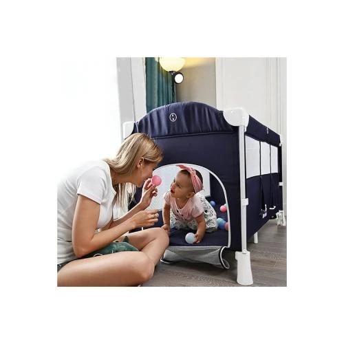 The Teknum 4 in 1 Baby Cot in Navy Blue by SAMBOX offers a magical all-in-one solution for new parents, combining a co-sleeper bassinet that attaches securely to moms bed, a spacious playpen with a removable second-floor bassinet, a detachable rocker for soothing comfort, and a diaper changing station with an organizer. Designed for babies from newborn to toddler (up to 30 kg), this foldable cot features a 360° mosquito net that protects your little one from insects, a zipper-enclosed side entrance for easy access, and two wheels for effortless mobility around the home or on the go. The included musical rotating toy bar with four bright toys helps promote sensory development, hand-eye coordination, and motor skills. Crafted from durable 210D Oxford fabric with steel tubing and sponge padding, this lightweight yet sturdy cot folds neatly into a carry bag for convenient travel. Its stylish navy blue design is a perfect accent for any nursery, offering comfort, safety, and practicality for busy families