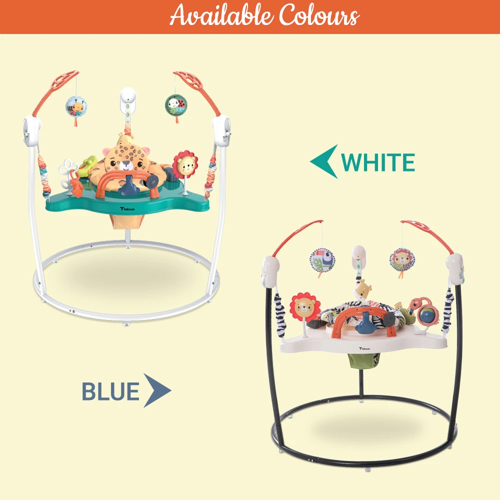 blue baby jumper, baby jumper with lights, music activity jumper, baby bouncing seat, interactive play jumper, teknum activity center, infant toy jumper, rotating seat jumper, early learning toy, safe baby activity jumper