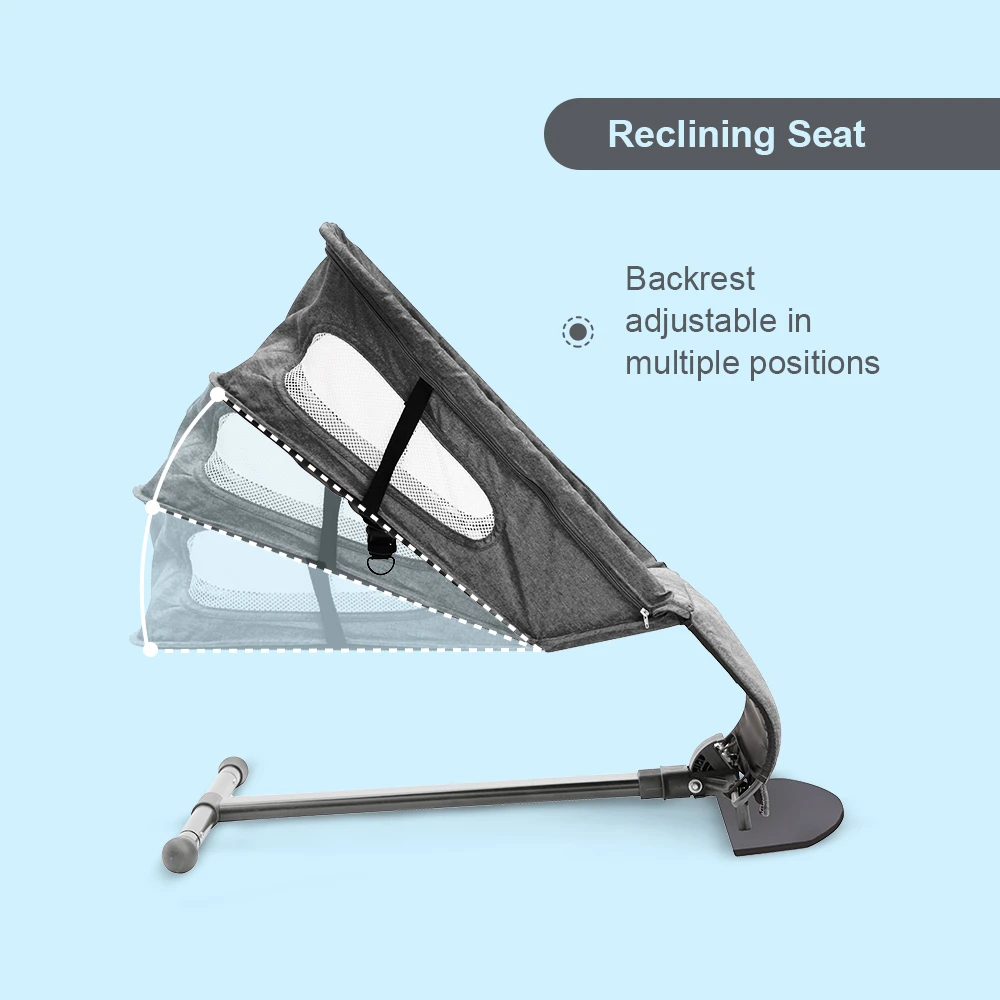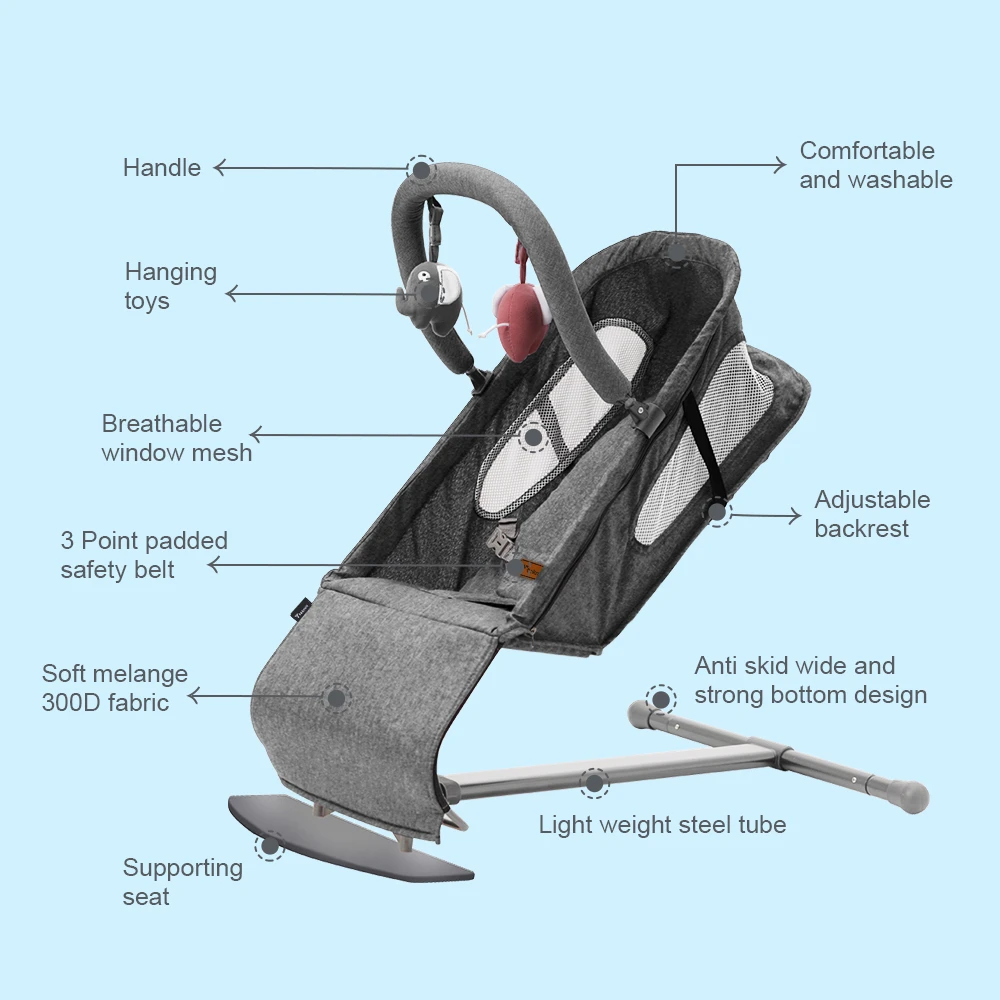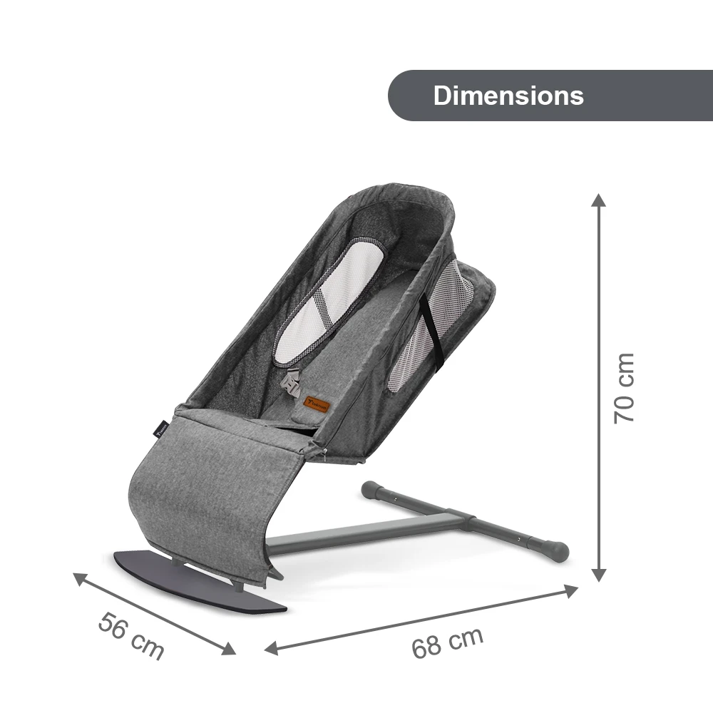 In a modern dark grey finish, the TEKNUM baby bouncer offers a blend of style, comfort, and functionality. The breathable, cushioned seat supports your baby while the gentle bounce provides a calming and soothing effect. Its motion is activated by natural movement, eliminating the need for batteries or cords. The attached grab toys are perfectly positioned to engage curiosity and promote sensory development, while also helping with hand coordination. The sturdy frame ensures stability, and the ergonomic design promotes healthy posture during use. Lightweight and foldable, it can be easily moved from room to room, making it perfect for both playtime and rest.